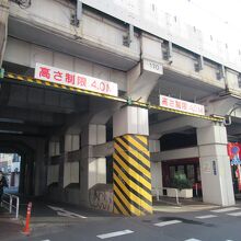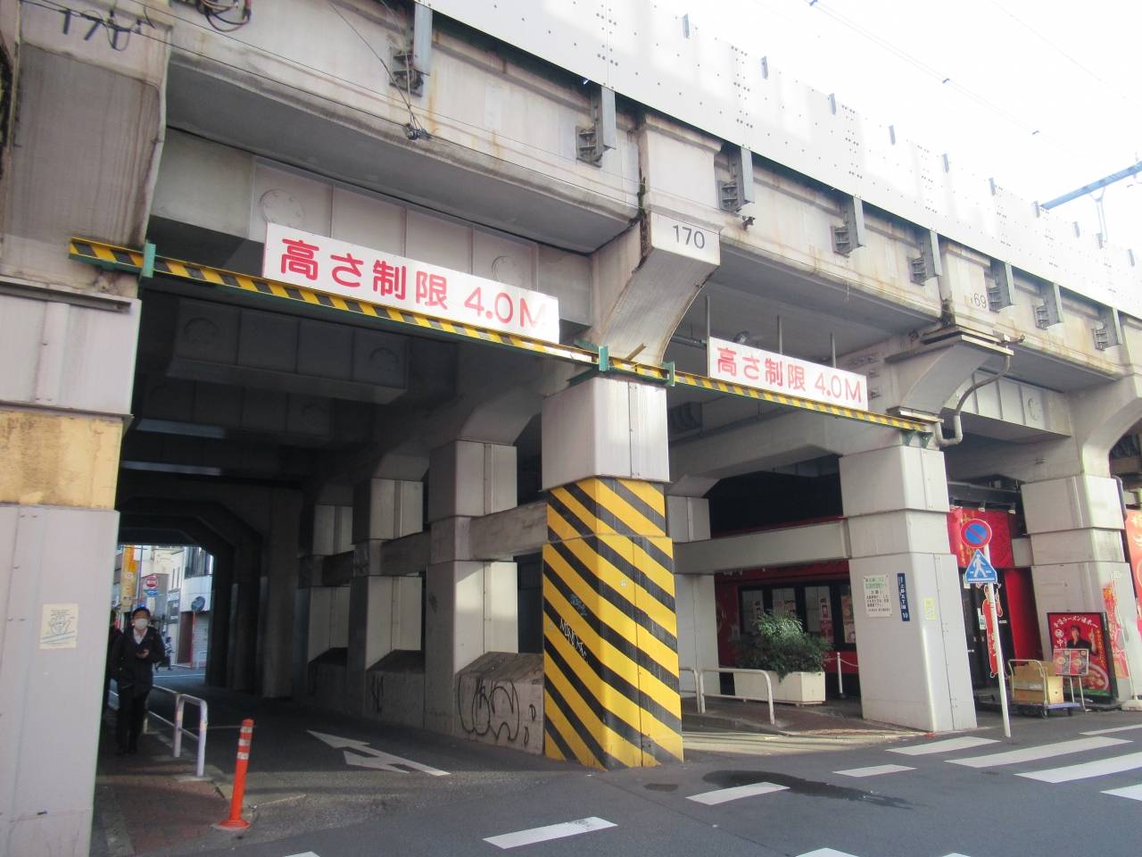 JR御徒町駅から秋葉原駅に向かって、高架橋や架道橋を巡りながら散歩をしていた際に立ち寄ったガードです。御徒町駅南口から秋葉原駅方向に1分ほど、2つの車線が柱で分かれている一方通行の道に架かる架道橋とガードです。架道橋はコンクリート製のがっしりした橋で、ガード横にはラーメン店やカフェ、ステーキショップなどが店を出しています。