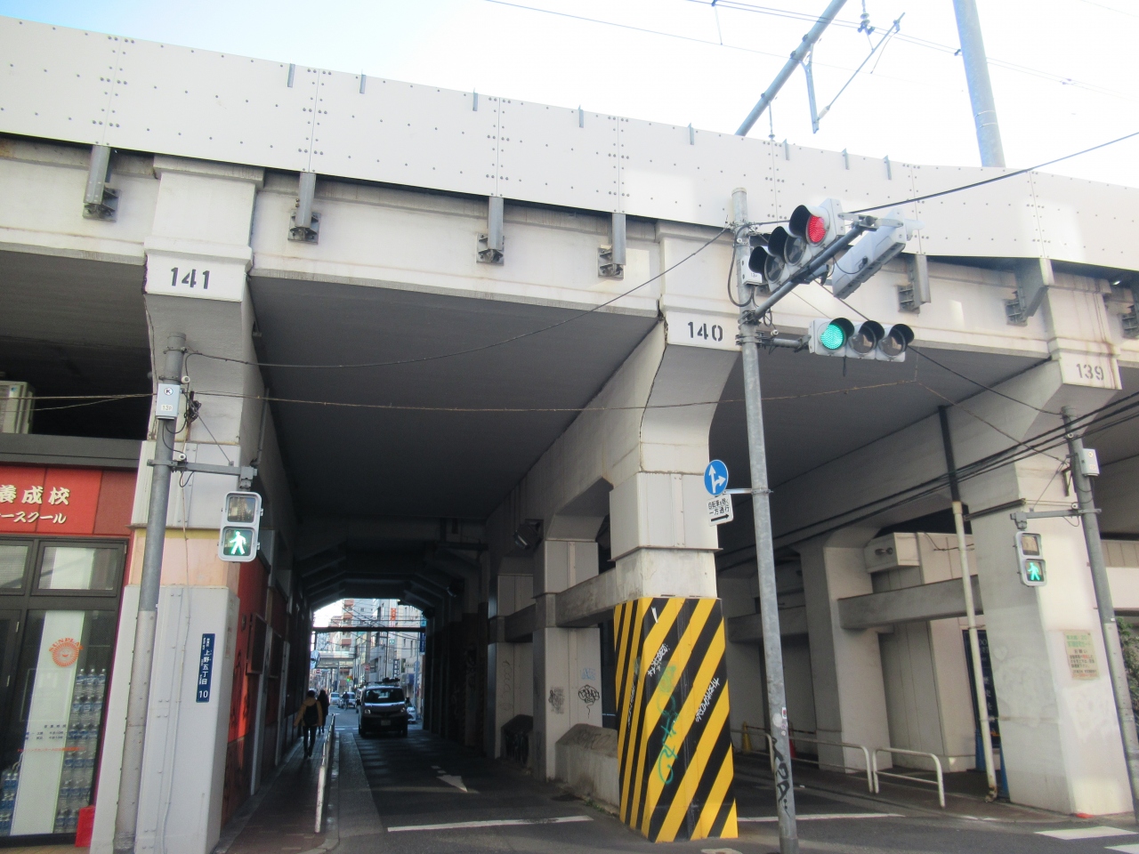 JR御徒町駅から秋葉原駅に向かって、高架橋や架道橋を巡りながら散歩をしていた際に立ち寄った架道橋です。御徒町駅南口から秋葉原駅方向に3分ほどのところに架かっています。橋の下は柱で2つに分かれた一方通行の道になっていて、スポーツトレーナースクールや商業施設2k540があります。神田周辺の煉瓦の架道橋と異なり、コンクリート製の柱で支えられているのが、御徒町周辺の架道橋です。