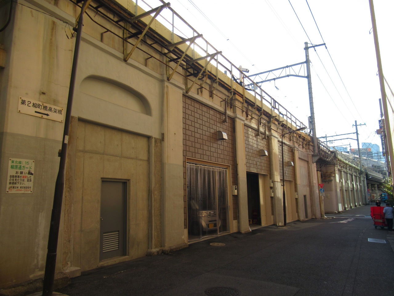 高架橋は観光施設ではありません。しかし東京駅と上野駅間の高架橋が完成したことで、100年近く前に山手線が環状運転されるようになり東京の近代化が進んだことを考えると、高架橋は貴重な歴史遺産と言えます。この高架橋もその一つで、秋葉原駅中央改札から秋葉原駅方向に6分ほどの、柳原通架道橋と柳橋架道橋の間に架かる40mほどの高架橋です。橋の下には倉庫が造られ有効活用されています。