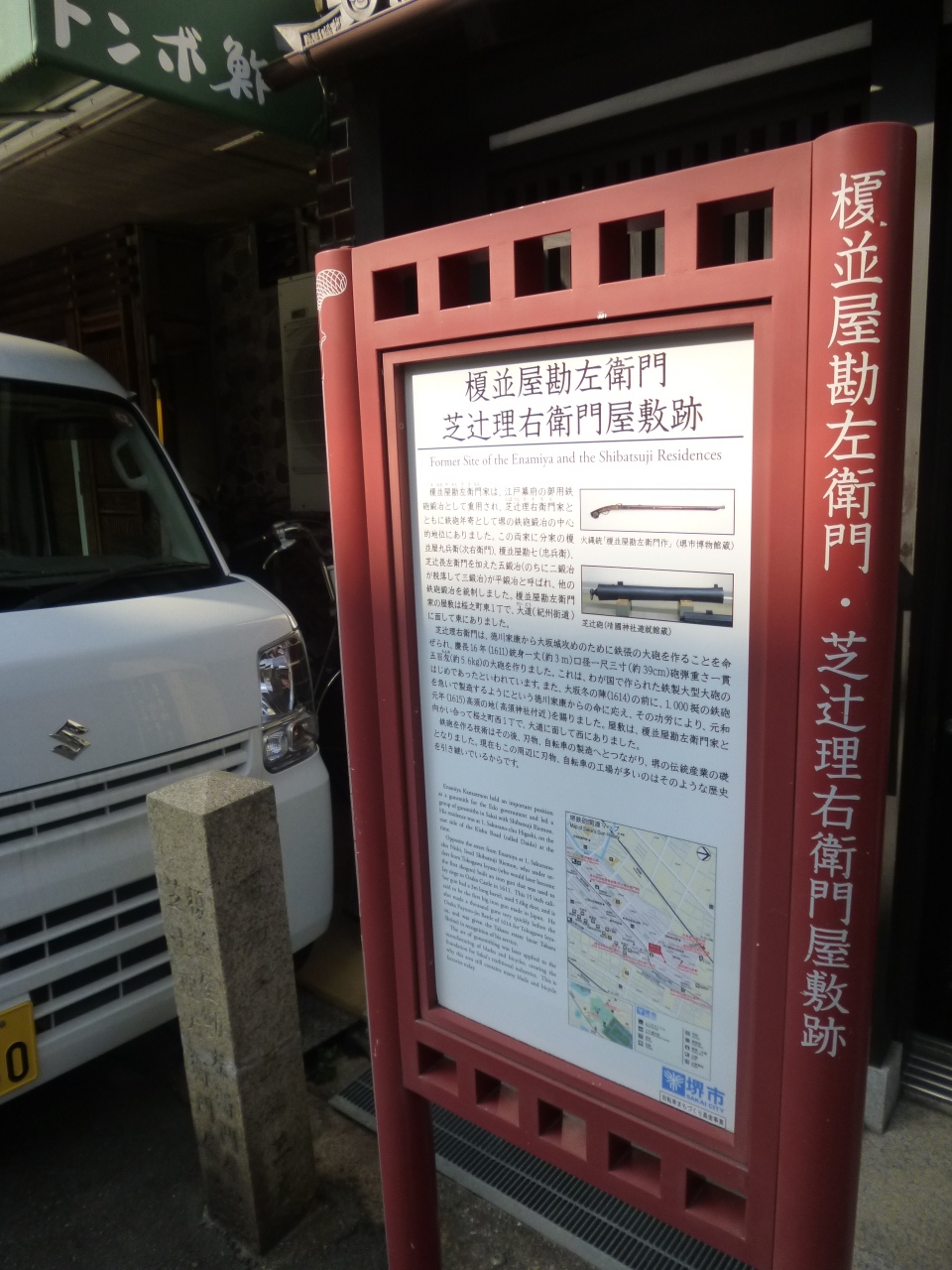 堺市旧市街の紀州街道沿いの建物前に「榎並屋勘左衛門 芝辻理右衛門屋敷跡」と記された案内板があります。江戸時代の堺は鉄砲鍛冶が有名で、その中でも中心的存在だったのが、榎並屋勘左衛門家と芝辻理右衛門家だったということです。