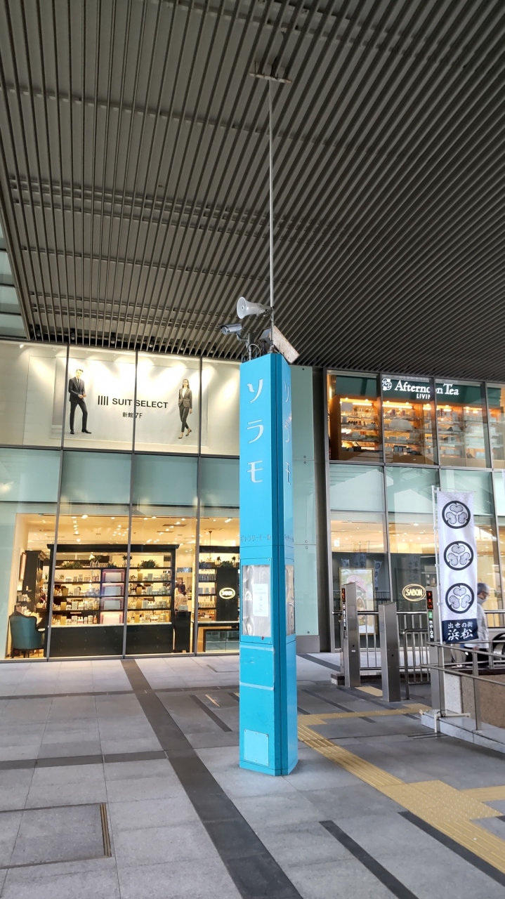 遠州鉄道の新浜松駅前の広場です。遠鉄デパートの前にあり、青いポールにソラモと書いてあります。イベントスペースで日中はマーケットが開かれたり、キッチンカーがとまっていたりと行き交う市民の交流の場にもなっています