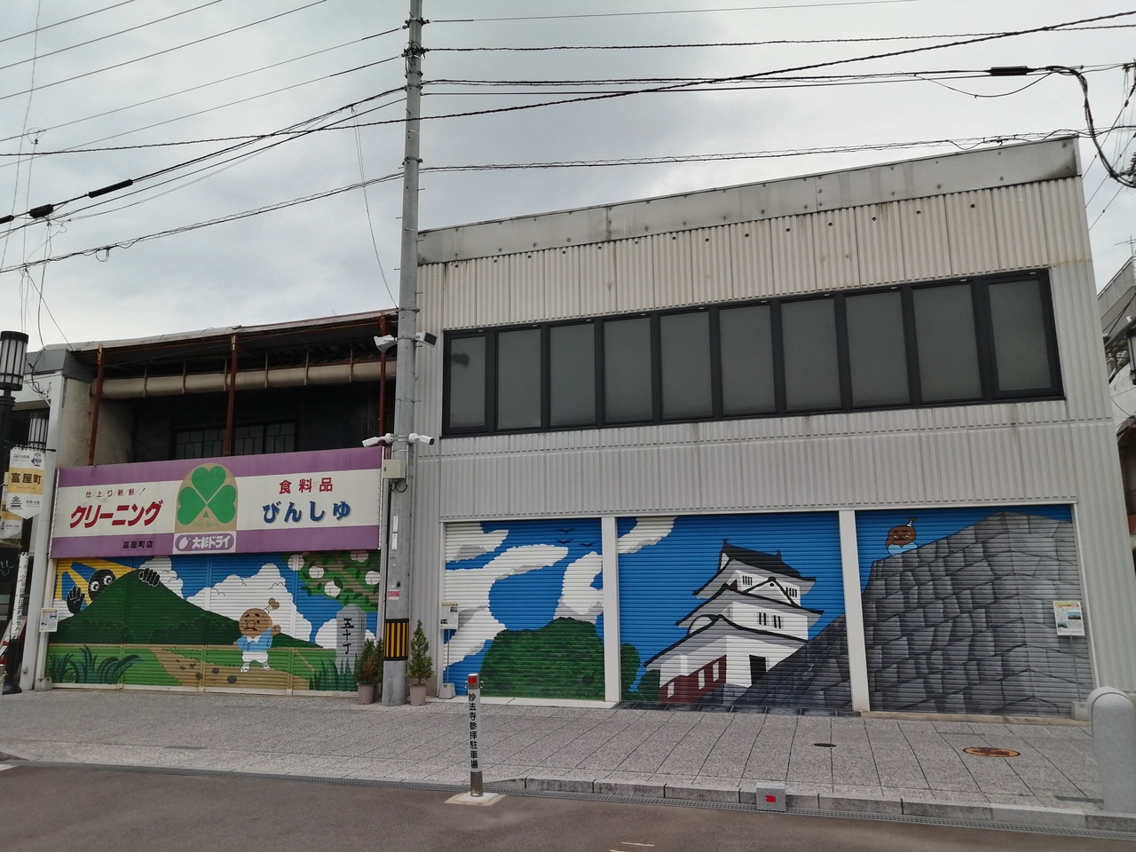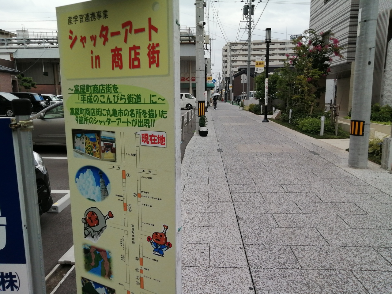 丸亀のアーケード商店街のメインストリート、通町商店街の1本西側を並行して走る通りです。ここが商店街?と思えるごくありふれた裏通り感しかありませんが、それもそのはず。2014年にアーケード、入口の看板などが撤去されたようです。事実上の“閉店”というでしょうか。しかし、今も営業されている店もあり、通り沿いには「富屋町」と書かれた“旗”が並んでいるので、まだ商店街ということのようです。“シャッターアート”という新しい試みも行われています。