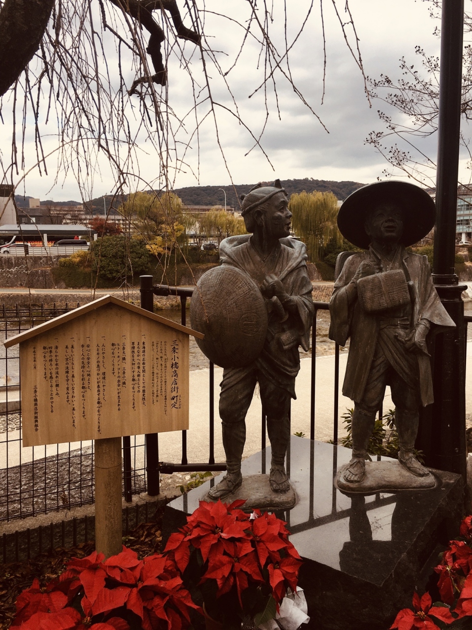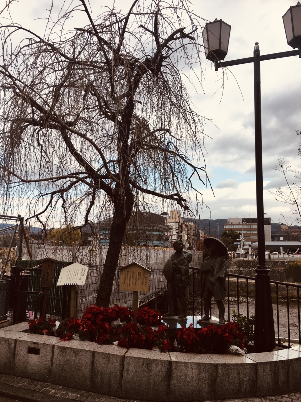 繁華街側の三条大橋渡る手前の横にありました。黒い台座の上にのっていて、今にも歩き出しそうな旅の姿でした。顔の表情は何かを見ているような顔立ちでした。後方下には鴨川が流れ、囲いに囲まれ、花壇のようになっていました。
