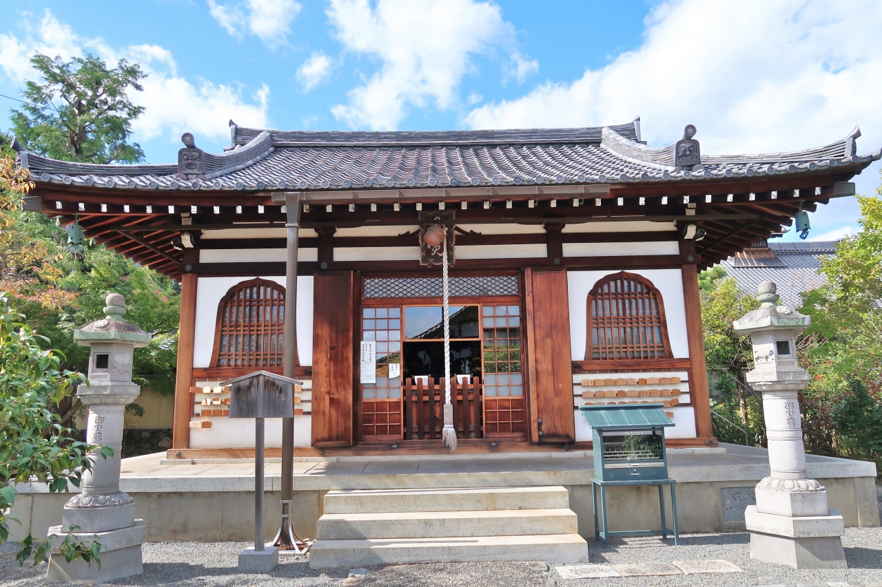 日本画家の竹内栖鳳氏の御子息が弘源寺で病気の療養をしていた関係で、襖に描かれた扇の形の障壁画や兎や猫が描かれた日本画を鑑賞できます。嵐山を借景にした枯山水庭園「虎嘯の庭」も、ガラス越しに見ることができました。