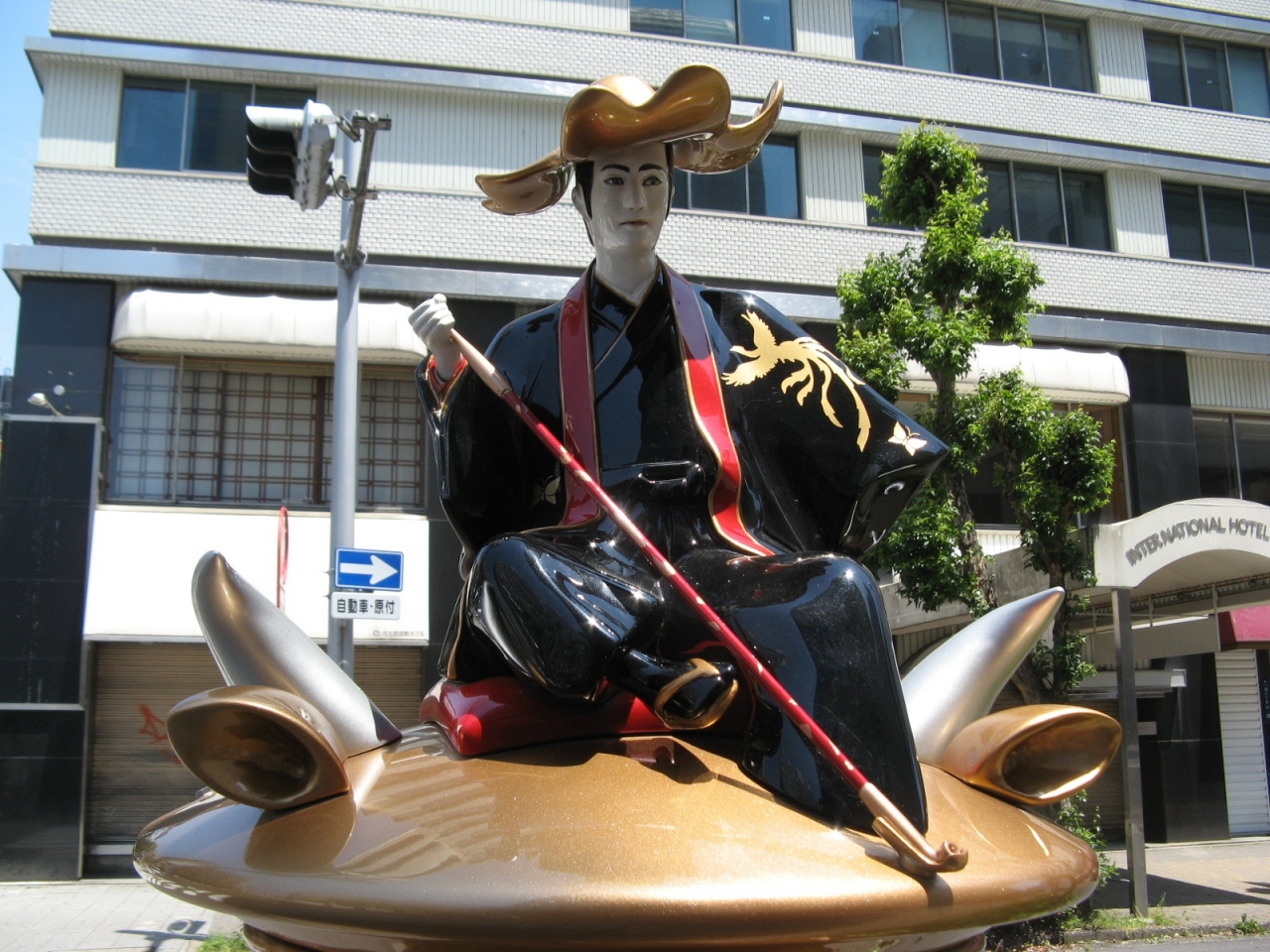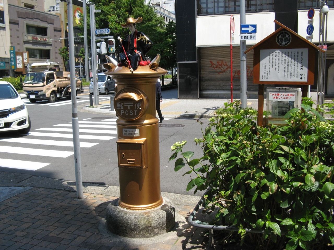 地下鉄の栄駅から西に錦通りを2分程歩いたところにある尾張藩七代藩主徳川宗春の人形が乗る金色のポストです。宗春公は尾張名古屋の繁栄の基礎を築いた人だそうで、宗春公が牛に乗って名古屋の町を移動していたことから、牛をイメージしたポストの上に派手な服を着て長いキセルを持った宗春公が乗っています。