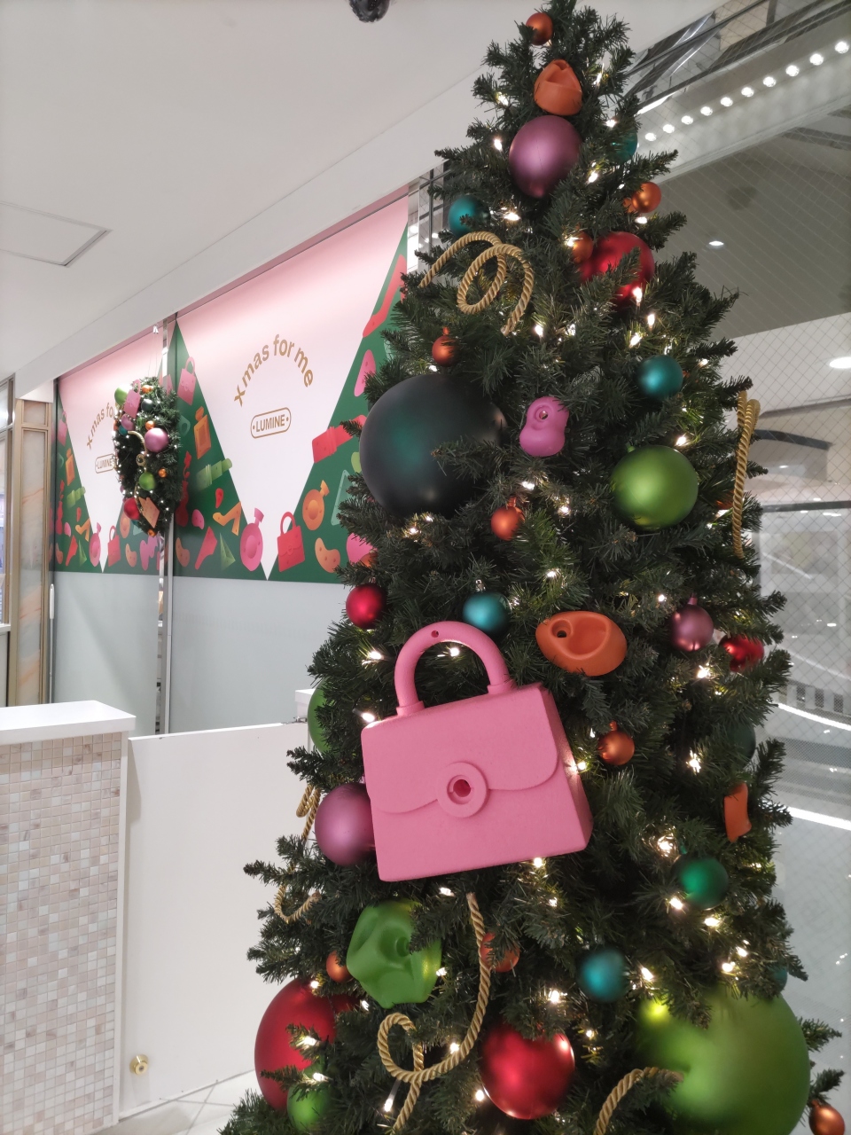一番立地が良い場所にある新宿のルミネがこのルミネ2。インフォメーションのカウンターのそばにルミネらしい遊び心のあるクリスマスツリーがかざってあった。バッグが飾ってあり、そんなに大きくないけどポップでかわしい