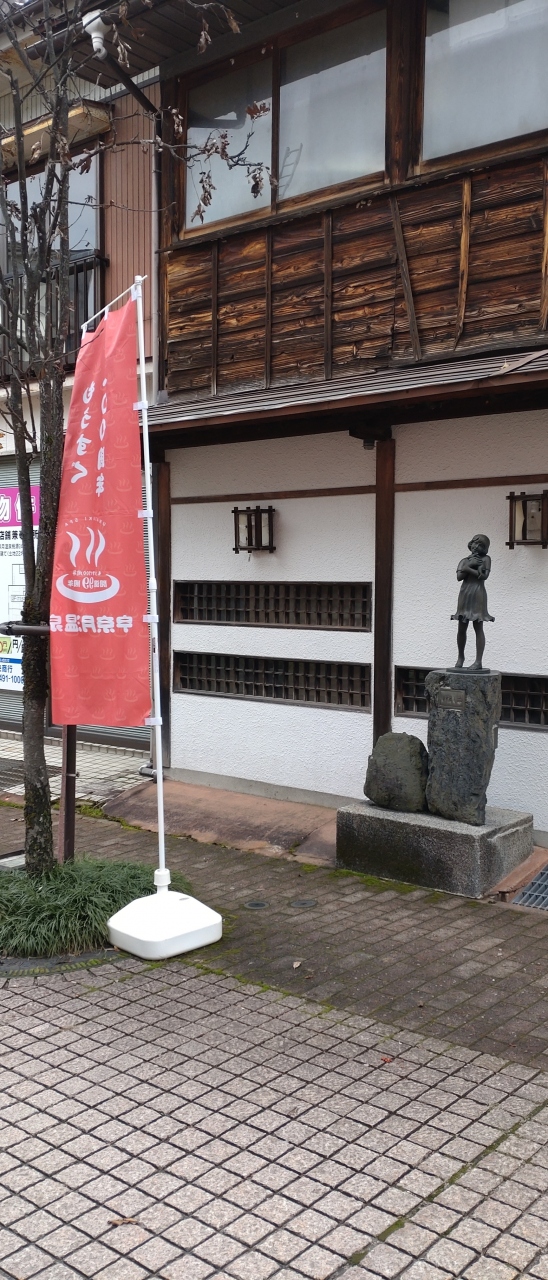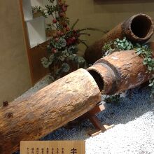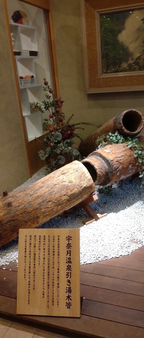 開湯99周年と言うことで、「もうすぐ100周年」と記した えんじ色の旗が温泉街の至る所に掲示されていました。お肌がつるつるになる「美肌の湯」はとても気持ちが良かったです。滞在ホテルでは昔使っていた「引き湯木管」が展示されていました。黒薙から約7kmを引湯しているそうです。現在は合成樹脂管の引湯パイプが使われています。