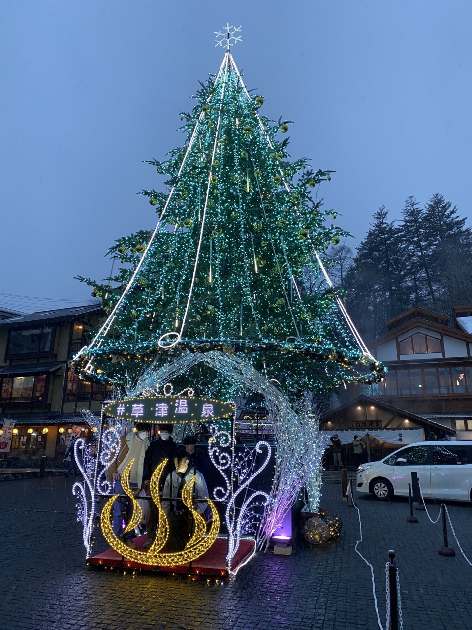湯畑の向かいにある広場です。12月になると、湯路広場にはクリスマスツリーが設置されます。16:30からクリスマスツリーのライトアップが始まり、クリスマスツリーの前で記念写真を撮る観光客が多くいました。