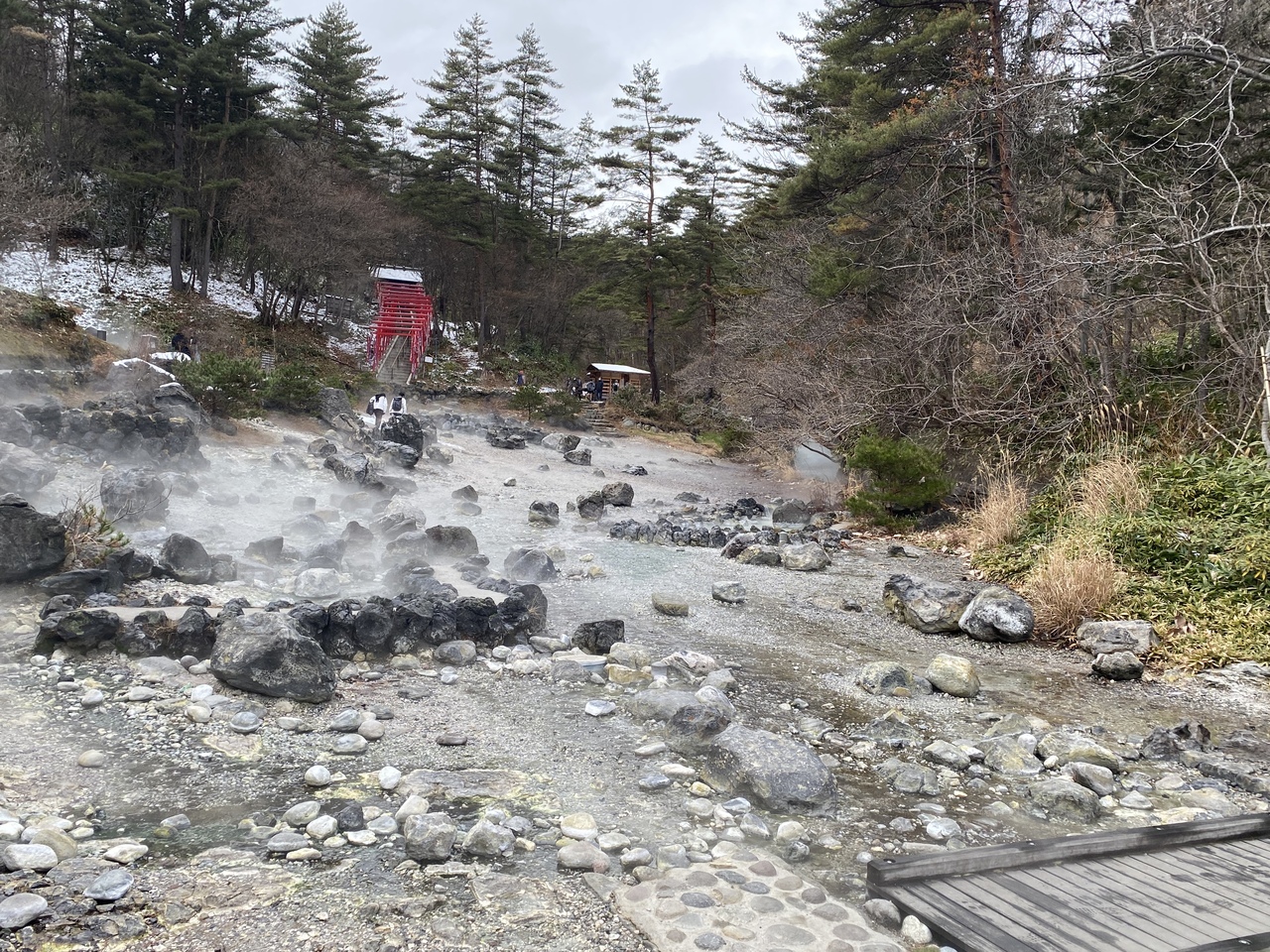 上州地粉うどんのまつもとの待ち時間を利用して行きました。西の河原の入口付近には、カフェ、ホテル、草津片岡鶴太郎美術館がありました。温泉が流れる河原なので、河原から湯けむりが立ち込めて、硫黄の匂いがしました。