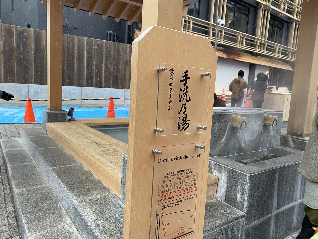 草津温泉には数ヶ所の手洗乃湯がありましたが、地蔵の湯の前にある手洗乃湯を利用しました。蛇口から温泉が出ていますが、手洗い以外の使用は禁止されていました。手洗い場湯は、ほんのり温かく、冷えた手が温まりました。