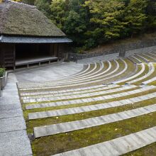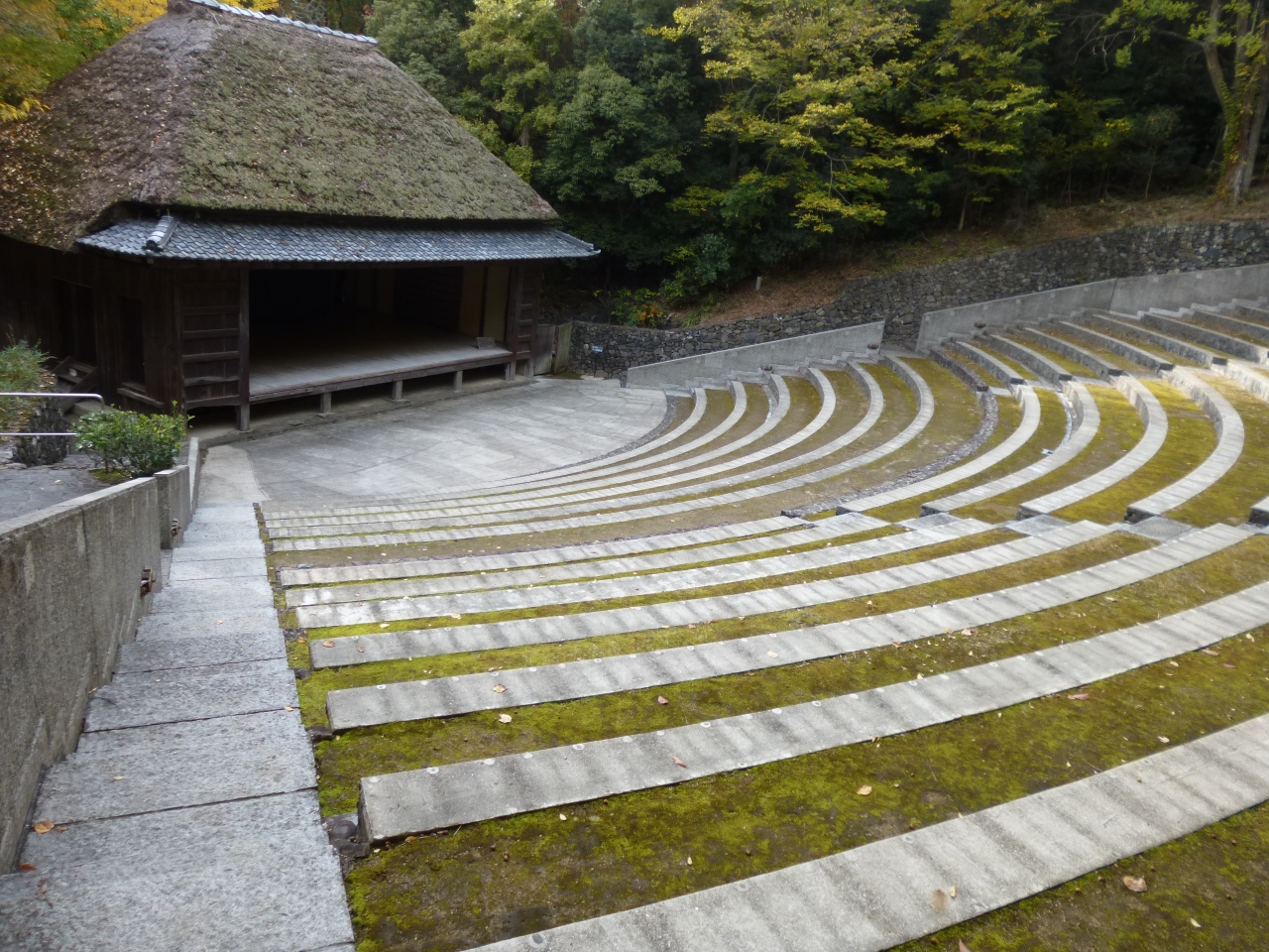 園内に入ってすぐ、徳島県の祖谷に現存するものを忠実に再現した伝統的なかずら橋を渡ると、小豆島農村歌舞伎舞台の裏手に出てきます。表側に回ってみると想像以上の規模の大きさにちょっと驚かされます。小豆島の小部地区が所有していたもので、島歌舞伎の舞台として使用されていたそうです。舞台中央には直径4.72mの廻り舞台があり、観客席は石垣を用いた階段式になっていました。