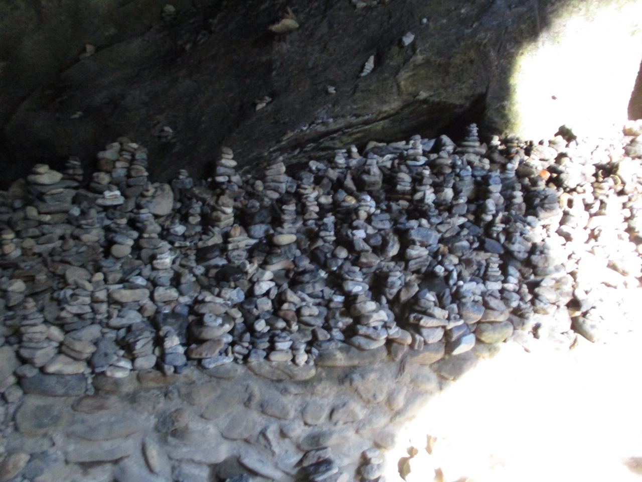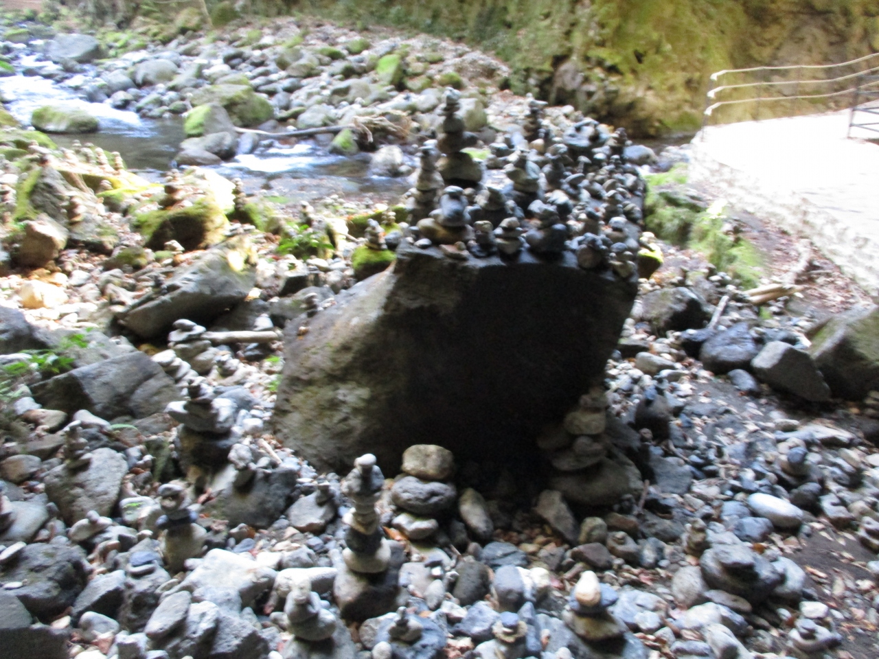 洞窟の前を流れる川一帯には、石を積むと願いごとが叶うという言われがあるそうで、賽の河原さながらにたくさん石が積まれていました。スピリチュアルスポット・パワースポットと言われているそうですが、神様の集った場所とする聖域的な雰囲気だけでなく、足元の積まれた石にはいろいろな人たちの思いが募ってることを感じました。