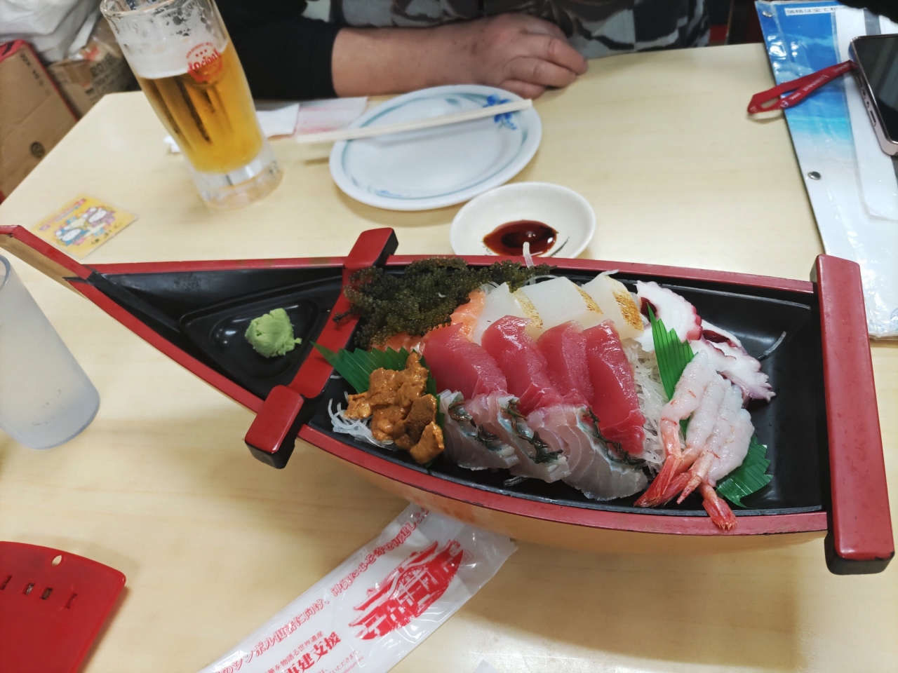 牧志公設市場は建替えのため(2022年12月現在)、新市場ができるまでの間の仮設市場である。1階の店舗は精肉・鮮魚・生鮮食品等を販売しており、2階には10余りの食堂がある。店によっては、1階の鮮魚店で蟹や魚を購入して2階の食堂で調理してもらって食べることも可能である。コロナ禍の影響もあってか、平日の6時頃食堂の多くがすでに閉店して4店舗しか営業していなかった。ツバメ食堂で、千ベロセット(1000円でアルコールとつまみ)と刺身盛り合わせを注文して飲食を楽しんだ。なお、千ベロセットは、生ビール3ジョッキ(オリオンの場合は2)である。