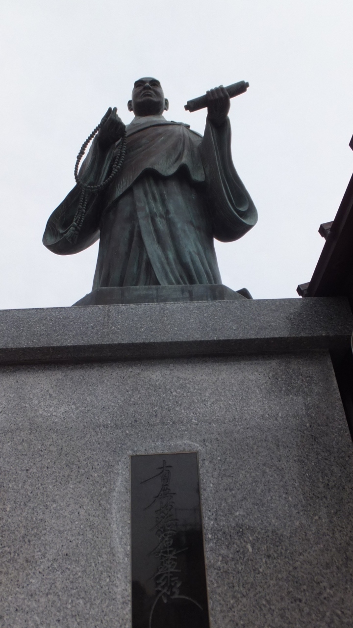 鎌倉にあるお寺の一つで、材木座方面にあります。日蓮宗のお寺で、海にまつわるものが多く奉納されているお寺です。小説家の泉鏡花もここにかかわる作品を残しています。入り口に大きな像が。そののち山門にて入山料金を支払って境内へ。境内にはかんきつの木が実をつけていて、季節を感じました。