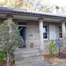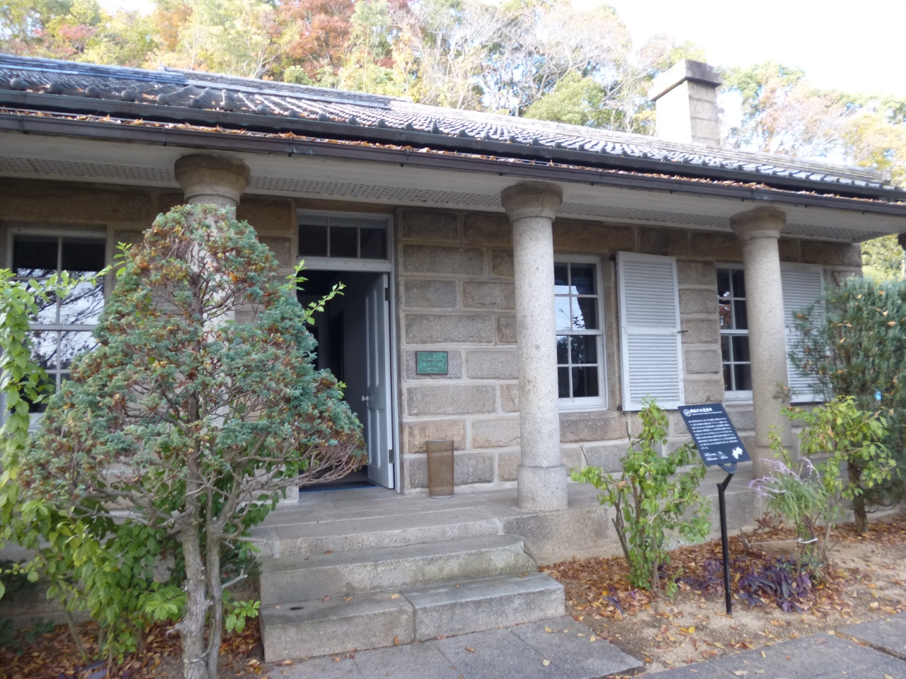 四国村の一番奥まったところに、旧大久野灯台があります。その並びにあるのが鍋島灯台退息所です。「退息所」とは灯台守の住宅のことだそうです。瀬戸内海の与島の隣にある鍋島という小さな島に明治6年に設置され、昭和30年ころまで宿舎として利用され、その後海上保安本部の通信施設として利用されたそうです。長い間海の安全のために尽くした建物です。