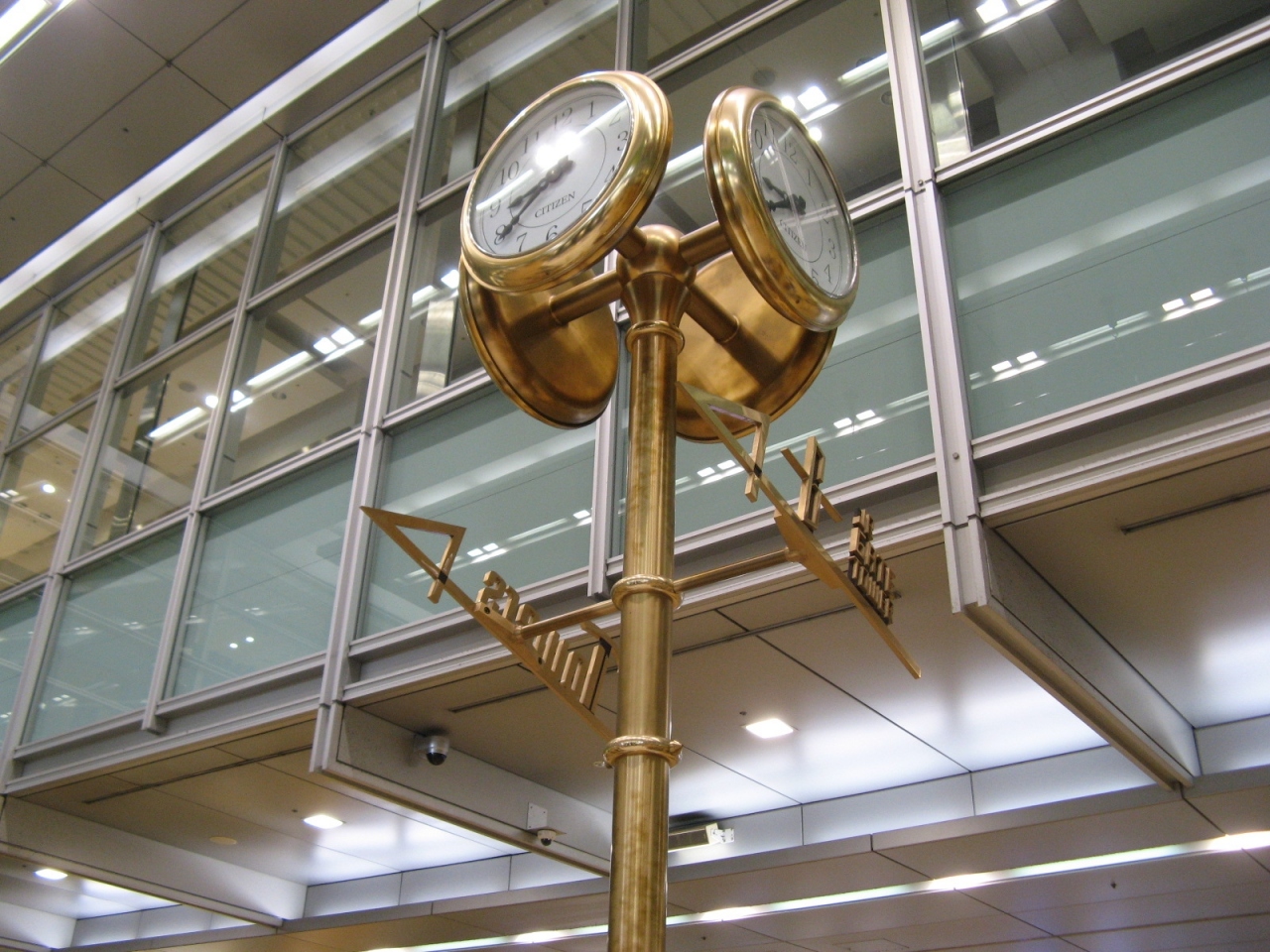 JR名古屋駅の構内、高島屋の入り口の前にある待ち合わせの目印として有名な金の時計。金色のアナログ時計を四面に配置したデザインで、全体を金色にしているところは名古屋らしいですが観光的にはそれほど特徴のあるものではなかったです。