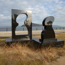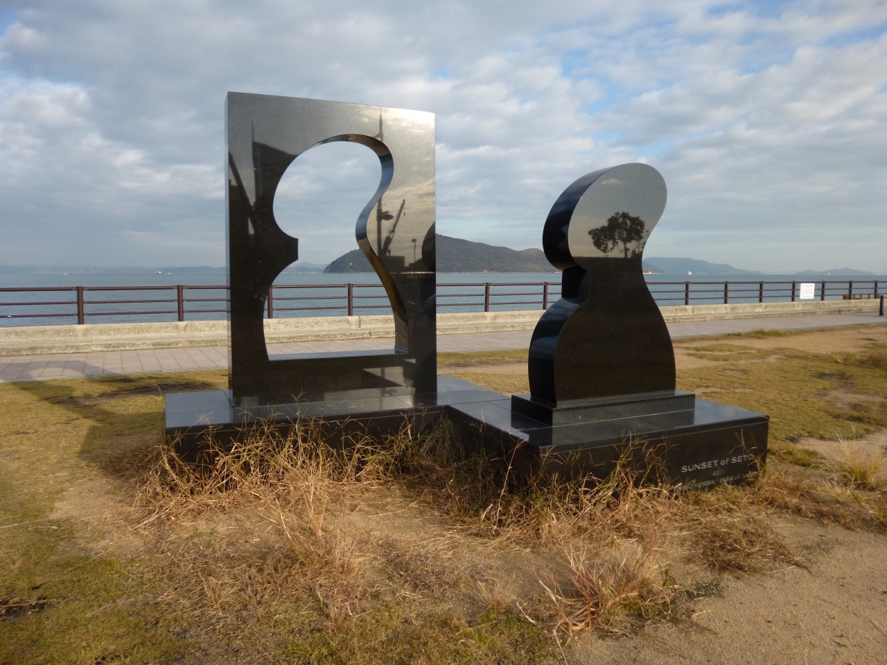 高松港周辺の再開発地区サンポート高松に設置されている石のモニュメントです。訪ねてみると、あるはずの場所が工事現場になっていました。ほんの少し離れたシーフロントプロムナード緑地という場所に移転していましたが、見ることができて良かったです。世界的な彫刻家、流政之氏の作品です。