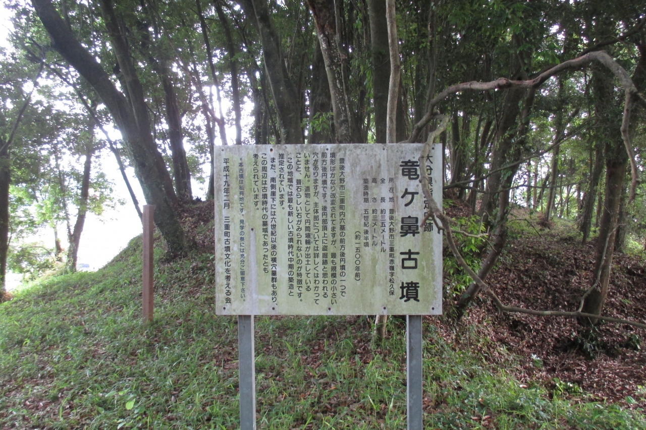 竜ヶ鼻古墳は、大原公園の西隣といったところにありました。斜面の大原公園の中腹辺りの位置関係となります。南を流れる三重川からは40mくらい上がっている台地となります。支配をしていた集落を見下ろせる場所だったのでしょうか。古墳時代中期の5世紀後半頃の築造の前方後円墳で、全長は約35m、後円部の径が約18m、前方部の長さが約17mだそうです。古墳ですといわれないと、分らないくらいの自然に見える膨らみで、細い木が全体に生えていました。