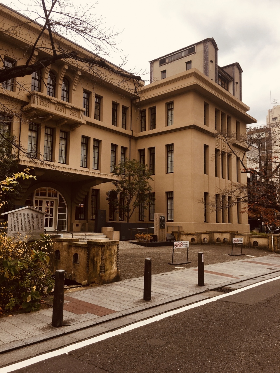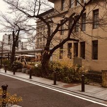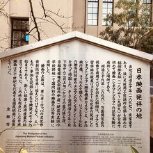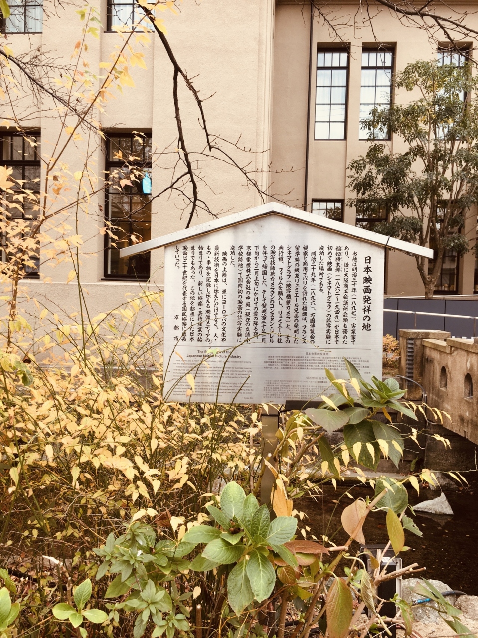 クリーム色の建物の手前付近に看板があって後方には川幅があまりない高瀬川が流れ、横には短い橋がありました。説明文には映画の試写実験に成功した稲畑勝太郎のことが記載してありました。横の草木に少し覆われていました。