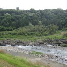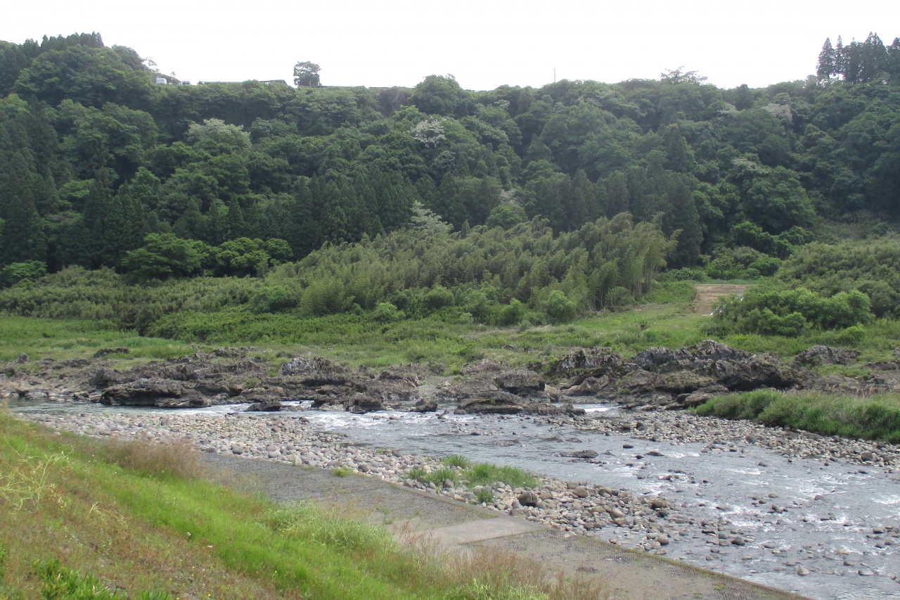 千歳町柴山のところで、大野川が東向きから北向きに流れを変えるコーナーのところにありました。この辺りの川底から荒々しい岩が重なる様に剥き出しになっていました。白亜紀の地層だそうです。手取蟹戸と呼ばれるところです。這い上がってきた蟹が手で捕まえられるので、この名になったとか。ここから目を上げると、道の駅みえの西側の端が見えました。