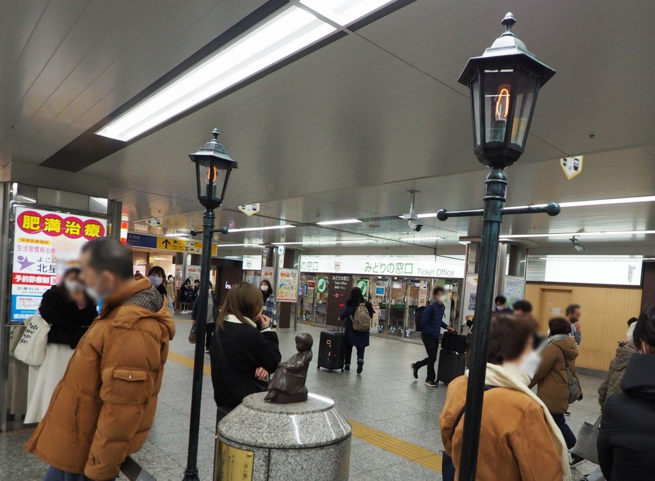 いつも人通りが多い横浜駅なので見落としがちなのですが、中央通路のど真ん中にガス灯のレプリカとともにあります。