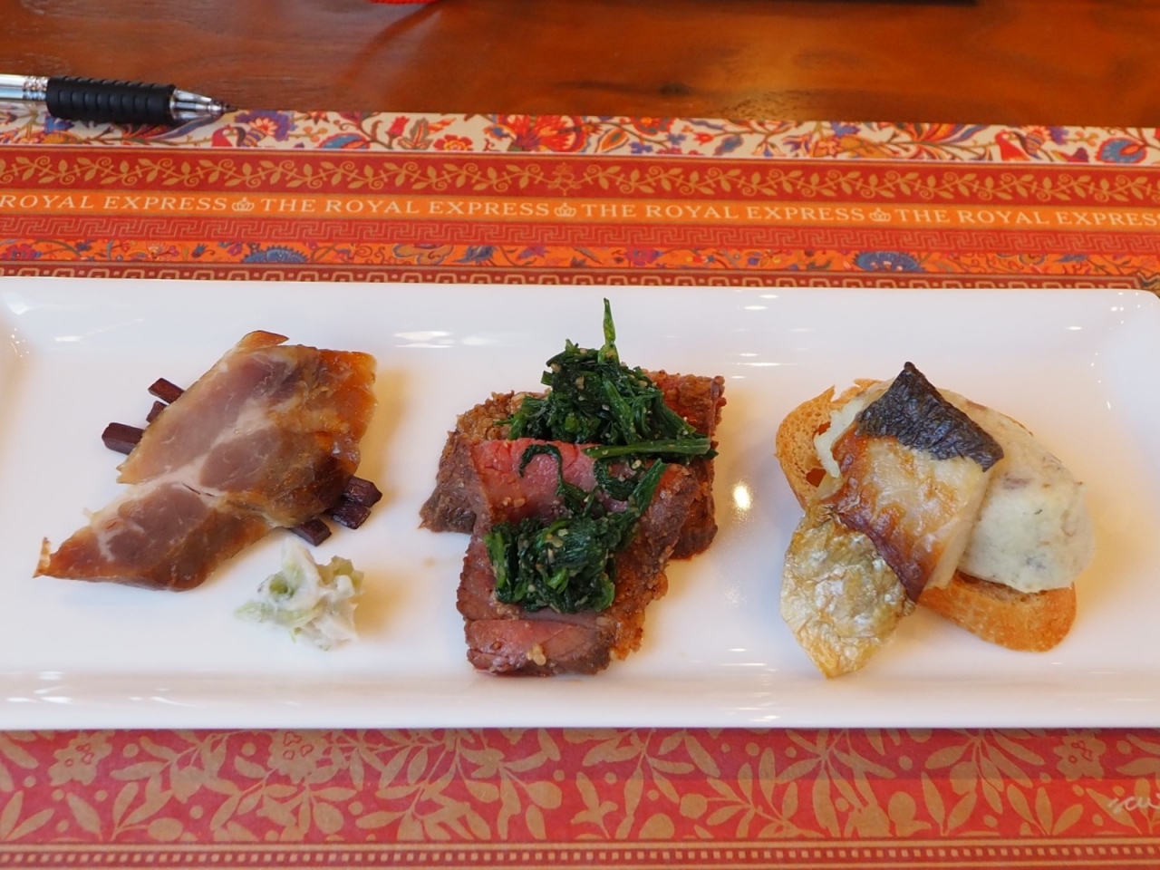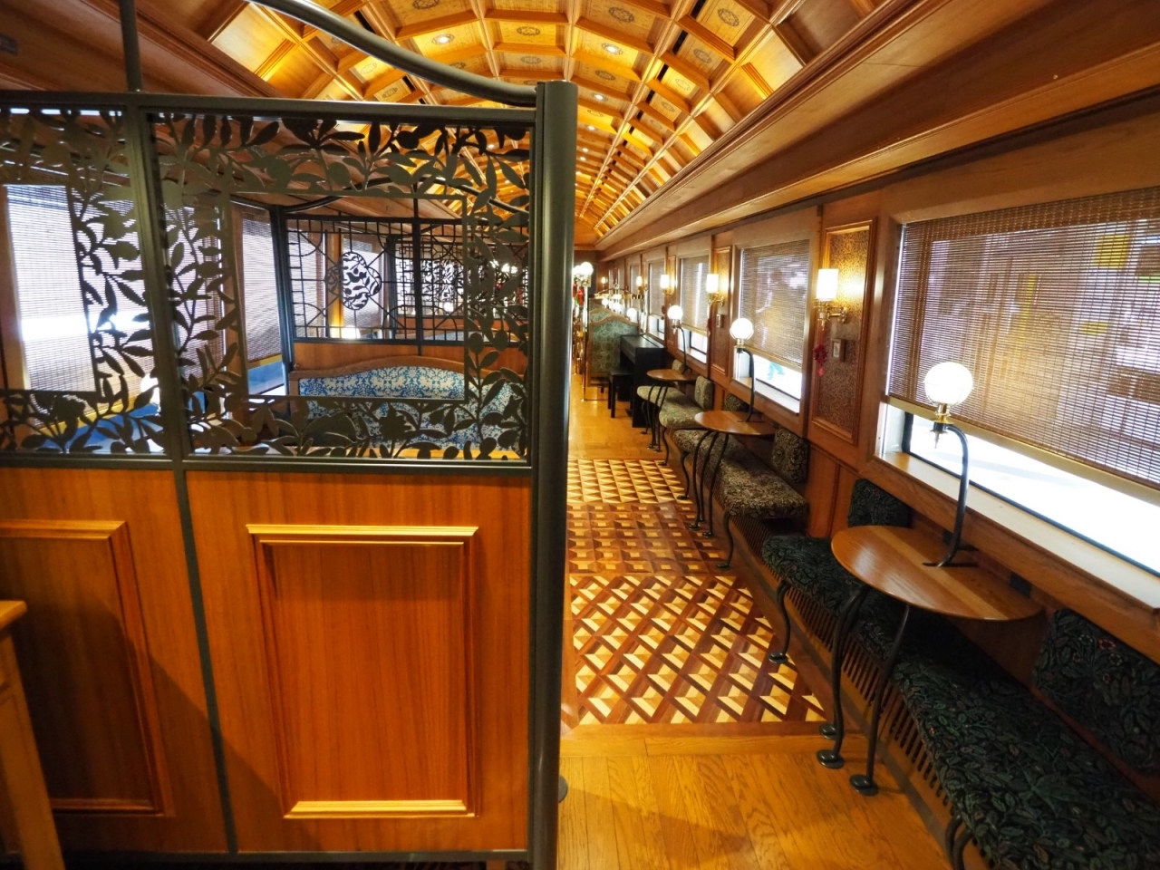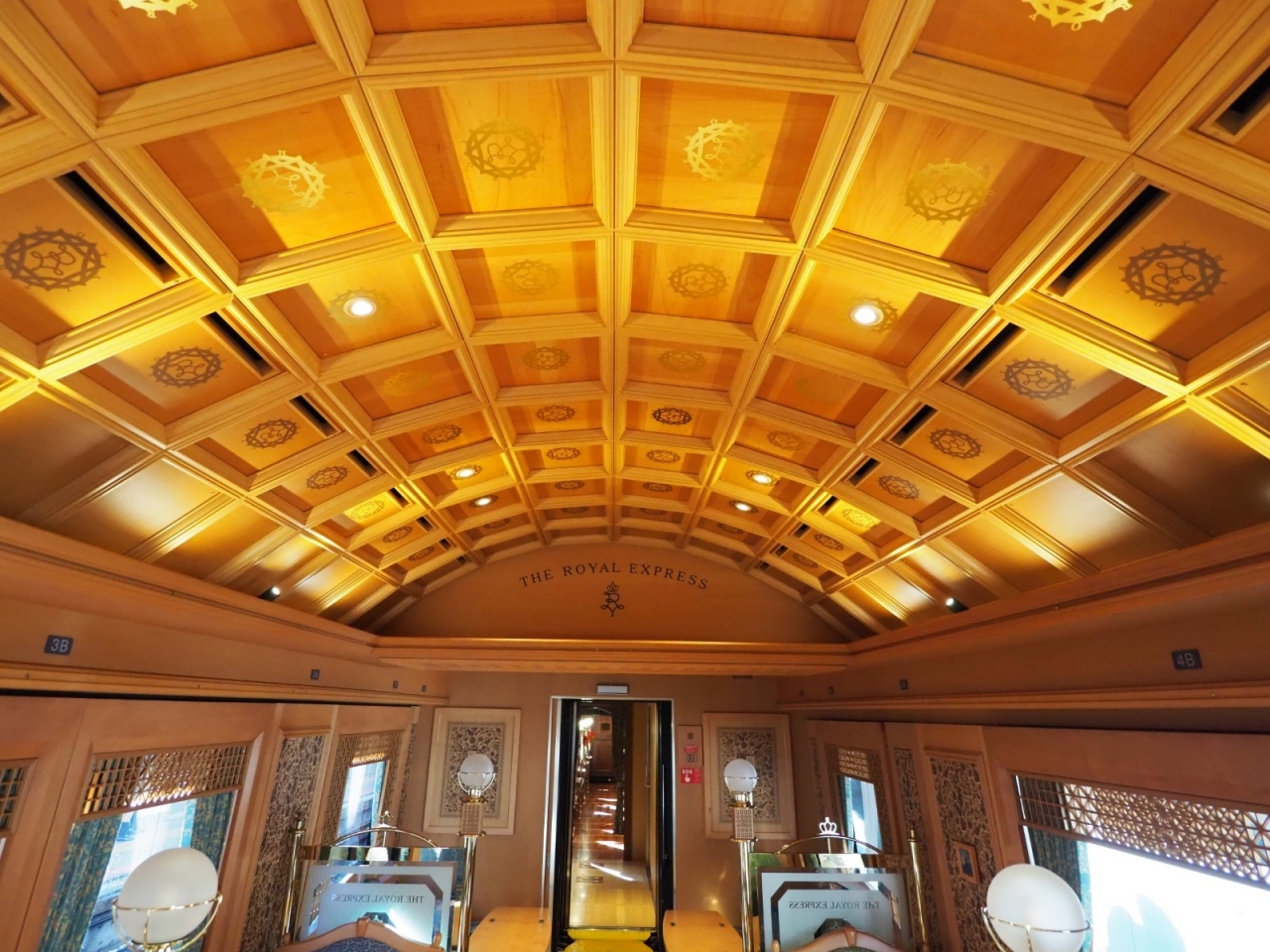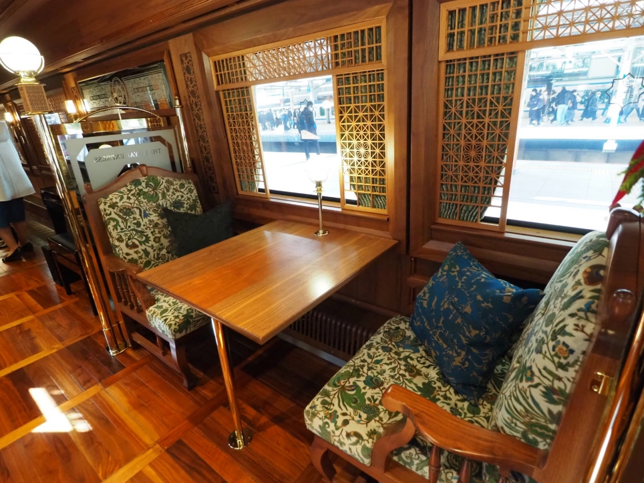 横浜駅にあるTHE ROYAL CAFÉでチェックイン。車両と同じ水戸岡鋭治さんデザインの豪華なゆったりとしたカフェでドリンクを頂きながら出発までの時間を過ごします。