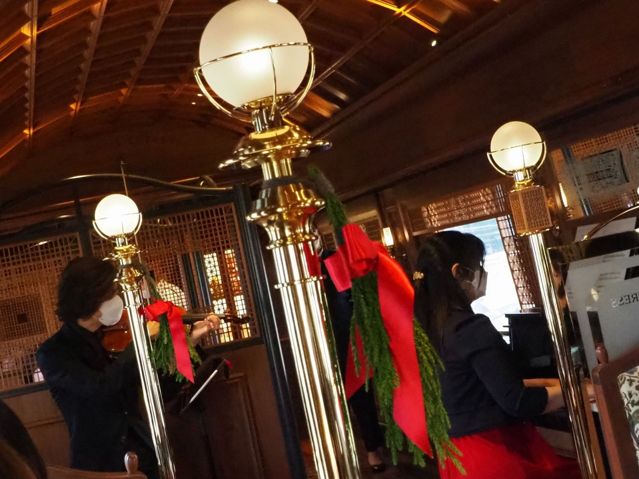 バイオリンとピアノの素敵な演奏を聴きながらランチ。この日は洋食プラン。伊豆の食材を多用したお料理の数々を景色と音楽と共にたのしみました。