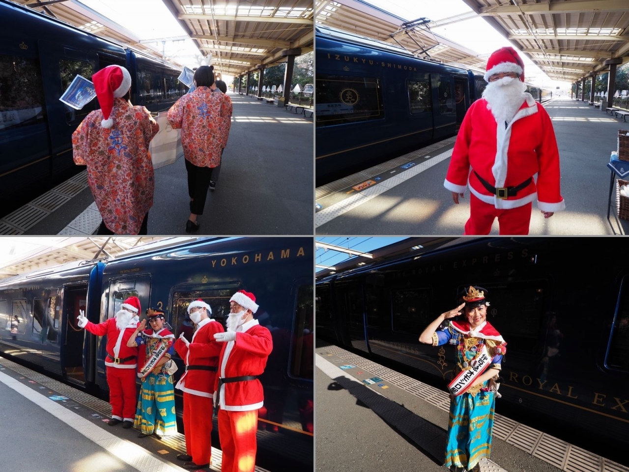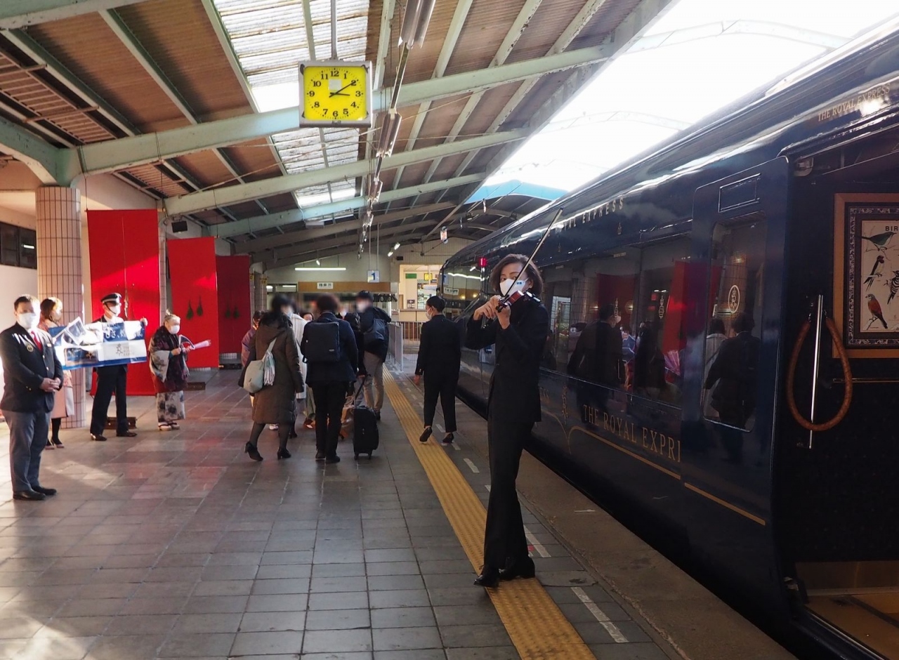 下田駅のホームでもバイオリンを演奏してのお見送り。そして伊豆の旅館の女将さんたちからのお花のプレゼント。最後までおもてなしたくさんの思い出深いクルーズトレインでした。