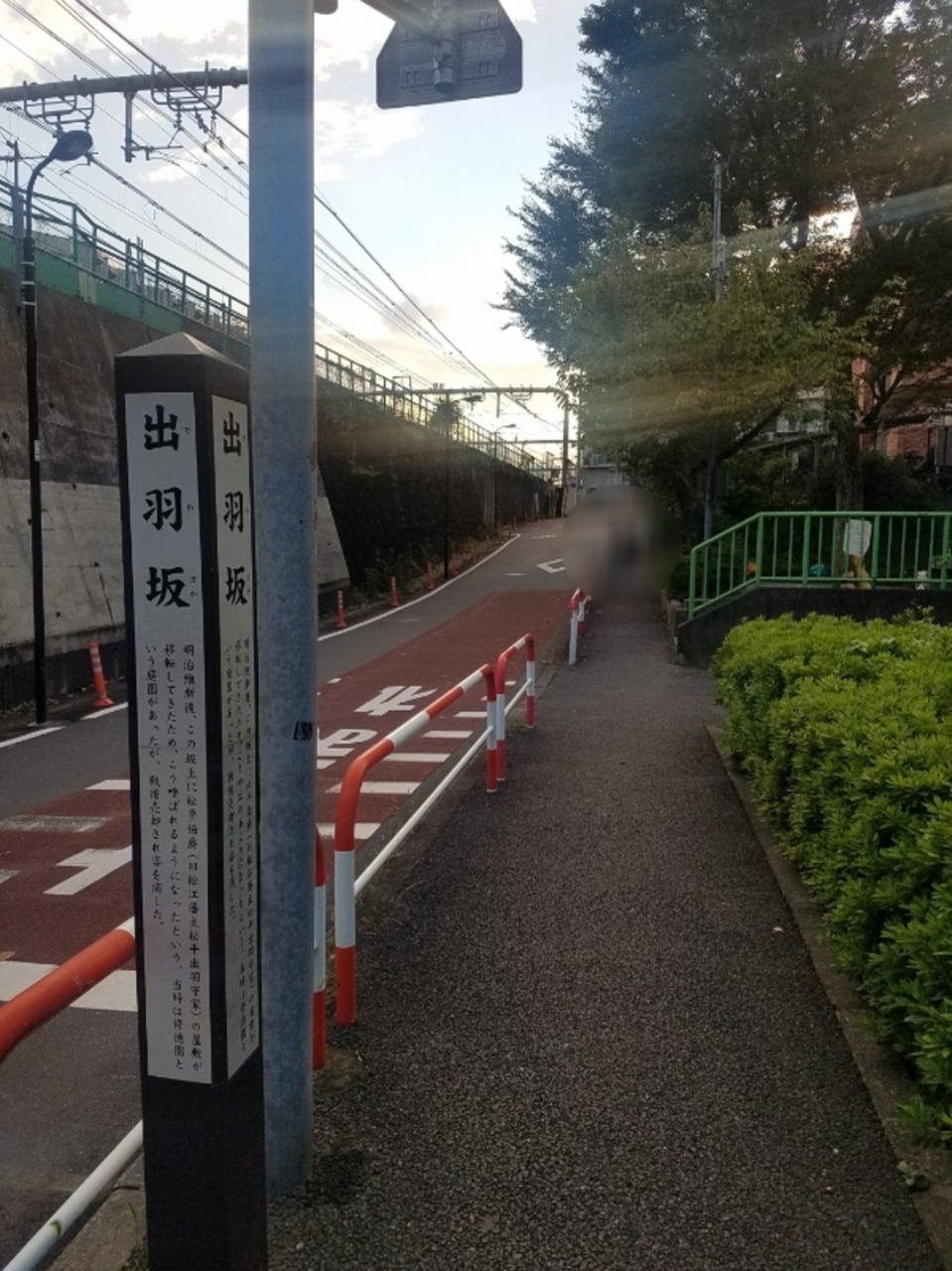 鮫ヶ橋せきとめ神から近くに見える首都高とJRの高架をくぐって左に曲がるとそのくぐったJRの線路の高さを目指すように上る坂です。昔、坂の上に旧松江藩主松平出羽守家の屋敷があったからとのことですが坂の名前はこういった由来も多いですが歴史が垣間見られるので良いですね。