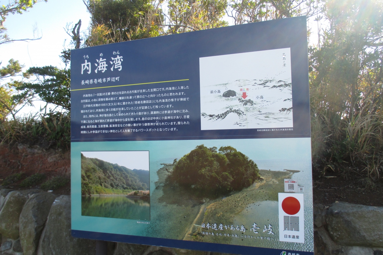 干潮であれば歩いて渡れるという小島(小島神社)を訪れました。場所は青嶋公園の西方となります。訪れた時は干潮とは正反対、見た目1mくらいの深さがありそうでした。そこに内海湾(うちめわん)の案内板があり、干潮の小島の写真も載っていましたから、ここはこれを見て我慢をしておきましょう。