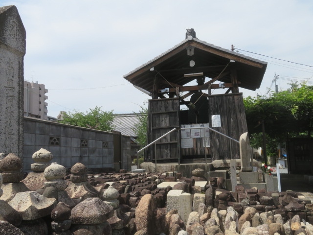 境内にある以外に質素な木造の建物があり、こちらに入っているのが、平安時代鋳造の名鐘である報恩寺の梵鐘です。この鐘には悲しい伝説があります。あと、この梵鐘の前に数多くの灯籠や石碑があって、報恩寺の神聖な聖域という雰囲気でした。