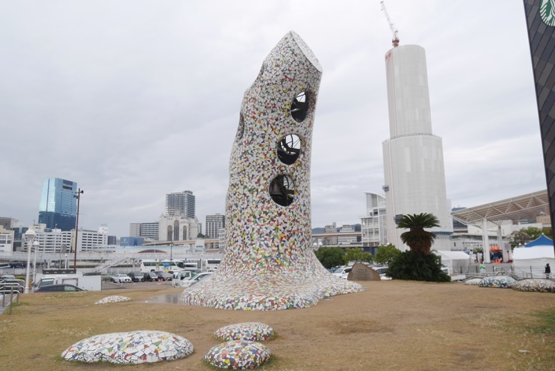ぱっと見で鐘感のない鐘なのがすごくユニークだなと感じます。神戸といえばファッションの街、という側面もあります。そんな神戸で開催されているファッションフェスティバルの第一回を記念してできたモニュメントだそうです。モザイクタイル貼りの外観はついつい角度を変えて見たくなりますね。