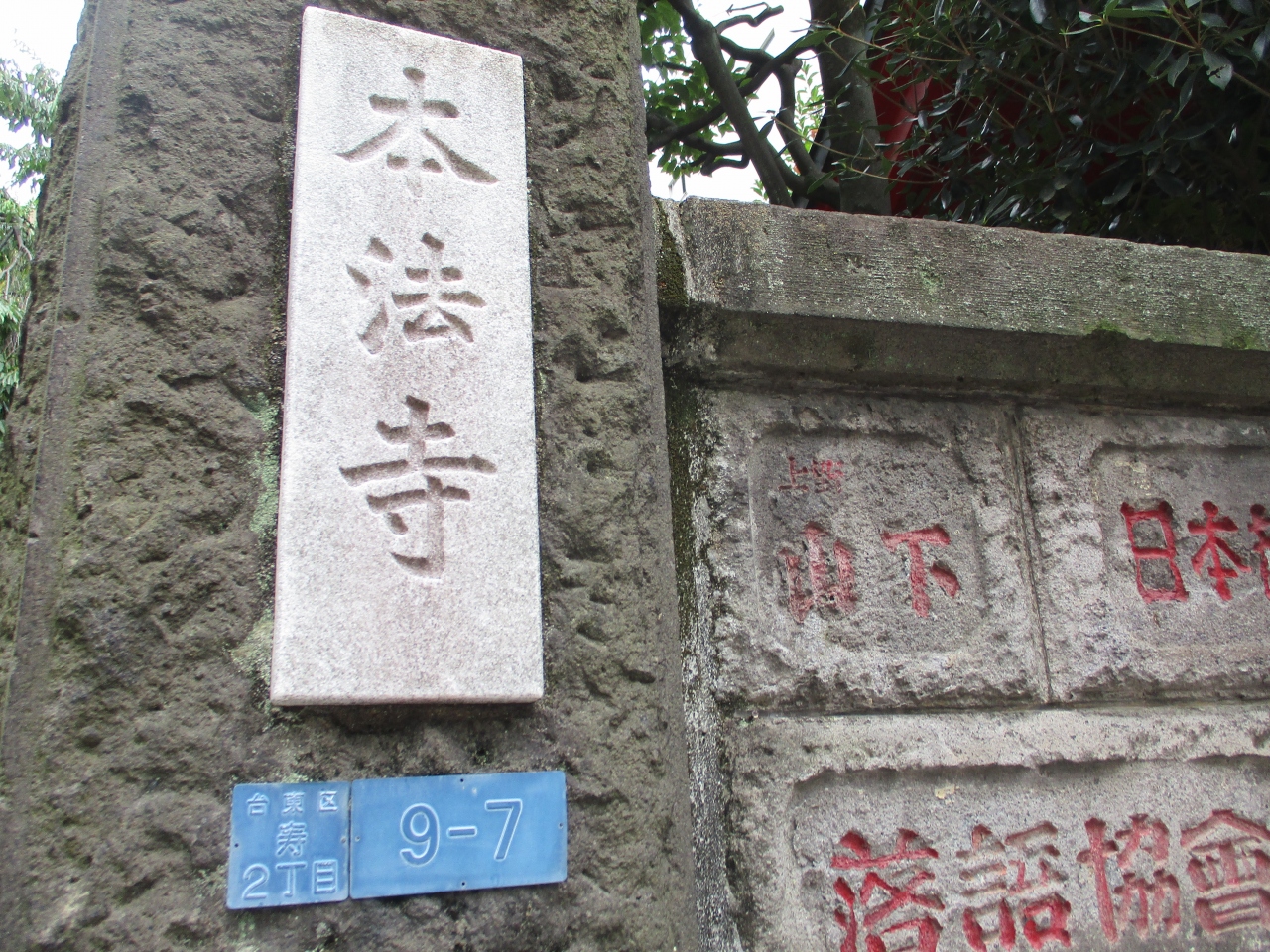 田原町駅周辺にはお寺がたくさんあります。本法寺はそのうちの一つです。田原町駅の南側にあります。日蓮宗の寺院です。こちらのお寺、印象的でした。ブロック塀のそれぞれに赤い字で寄進者の名前が彫られています。落語関係の名前が多かったです。境内には白狐を祀った熊谷稲荷、落語の台本を収めた「はなし塚」その他見どころがあります。