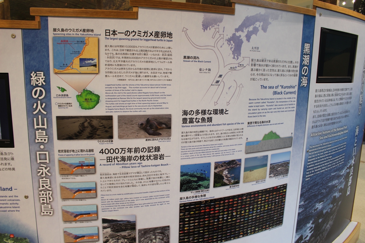 屋久島の世界自然遺産価値を紹介する施設です。縄文杉トレッキングへのバスが出る荒川登山バス停留所(屋久島自然館入口)もすぐ近くです。世界遺産となった理由となる自然を、パネル・映像などで紹介しています。富士山の世界遺産センターでも感じましたが、実物の自然を前にするとあまりここに寄る価値を感じませんでした。人気の世界遺産は情報が巷にあふれていますので。