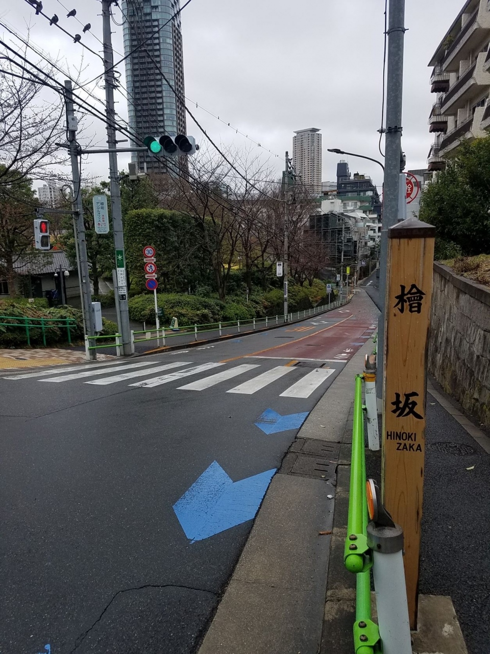 赤坂氷川神社から檜町公園を目指すとやがて下る坂です。檜町公園は江戸時代に檜の木が多くて檜屋敷と呼ばれた長州藩毛利家の屋敷があり、それに添う坂というのが由来だそうです。下りだからよかったものの、割りと勾配があるので上りはきつそうでした。