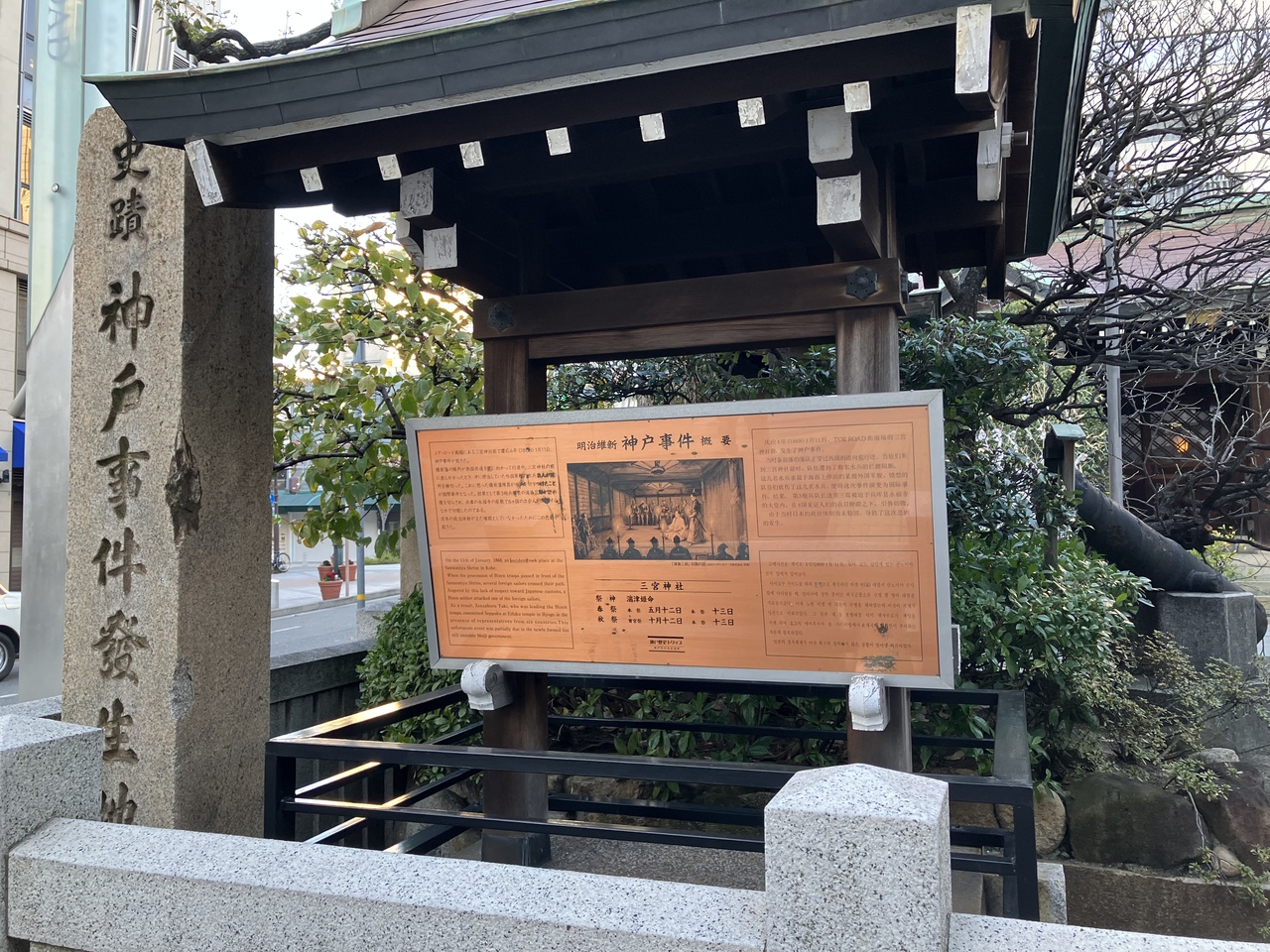 神戸市内の元町エリアにある三宮神社に参拝した際に、鳥居の横に神戸事件の石碑と説明板を見つけました。神戸事件とは、慶応四年に起きた事件で、備前藩の前を外国の水兵が横切ったことに怒った藩士が水兵を切り付けて国際問題に発展したそうです。神社と事件が結び付かず、意外でした。