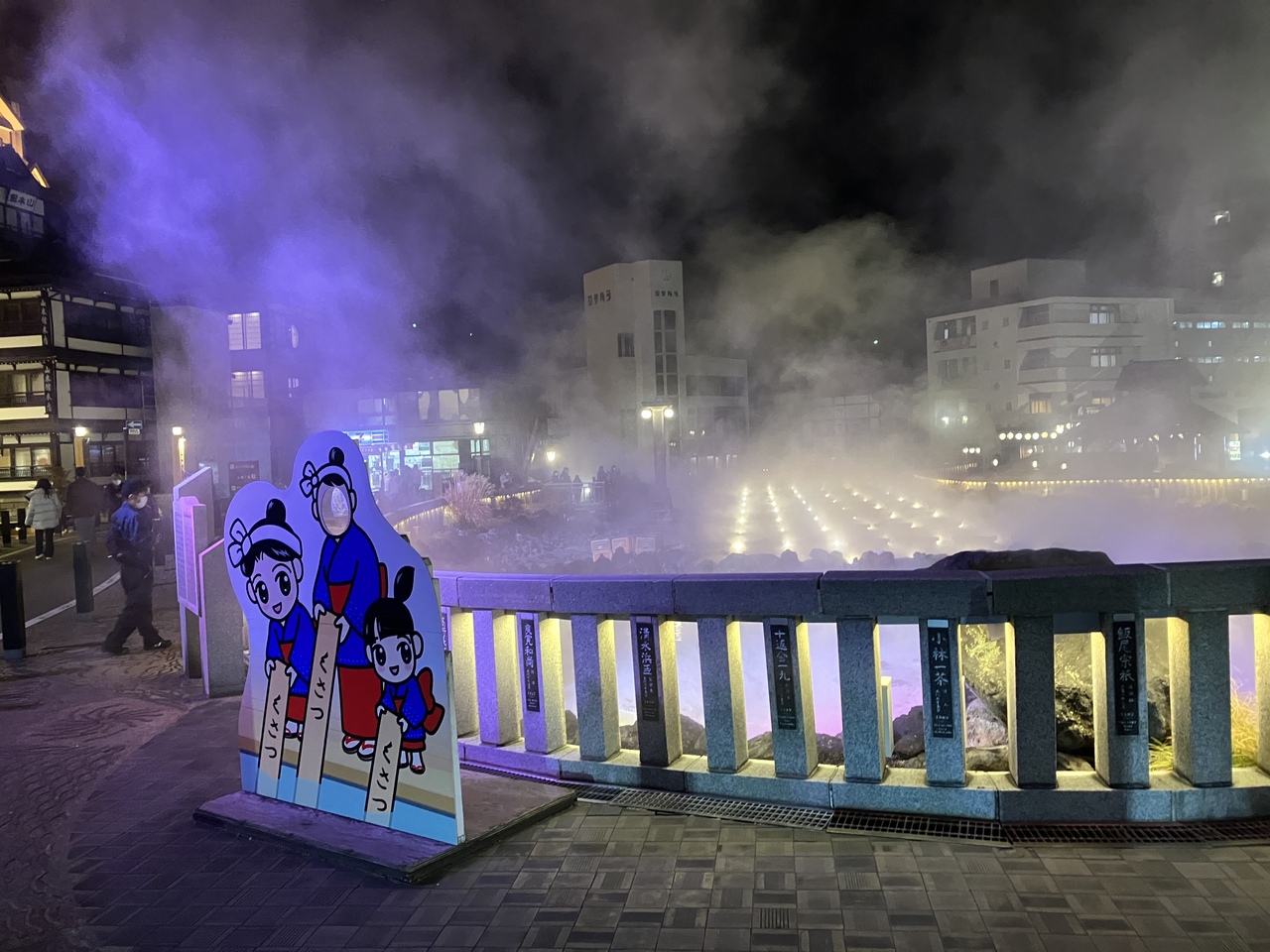 12月は、クリスマスツリーも点灯していました。西の河原近くの宿から歩いて行ったのですが、日が落ちた夕方ですでに道中のお店が閉まっていて、少し怖かったです。湯畑付近は人通りがあります。紫系の色で綺麗にライトアップされています。