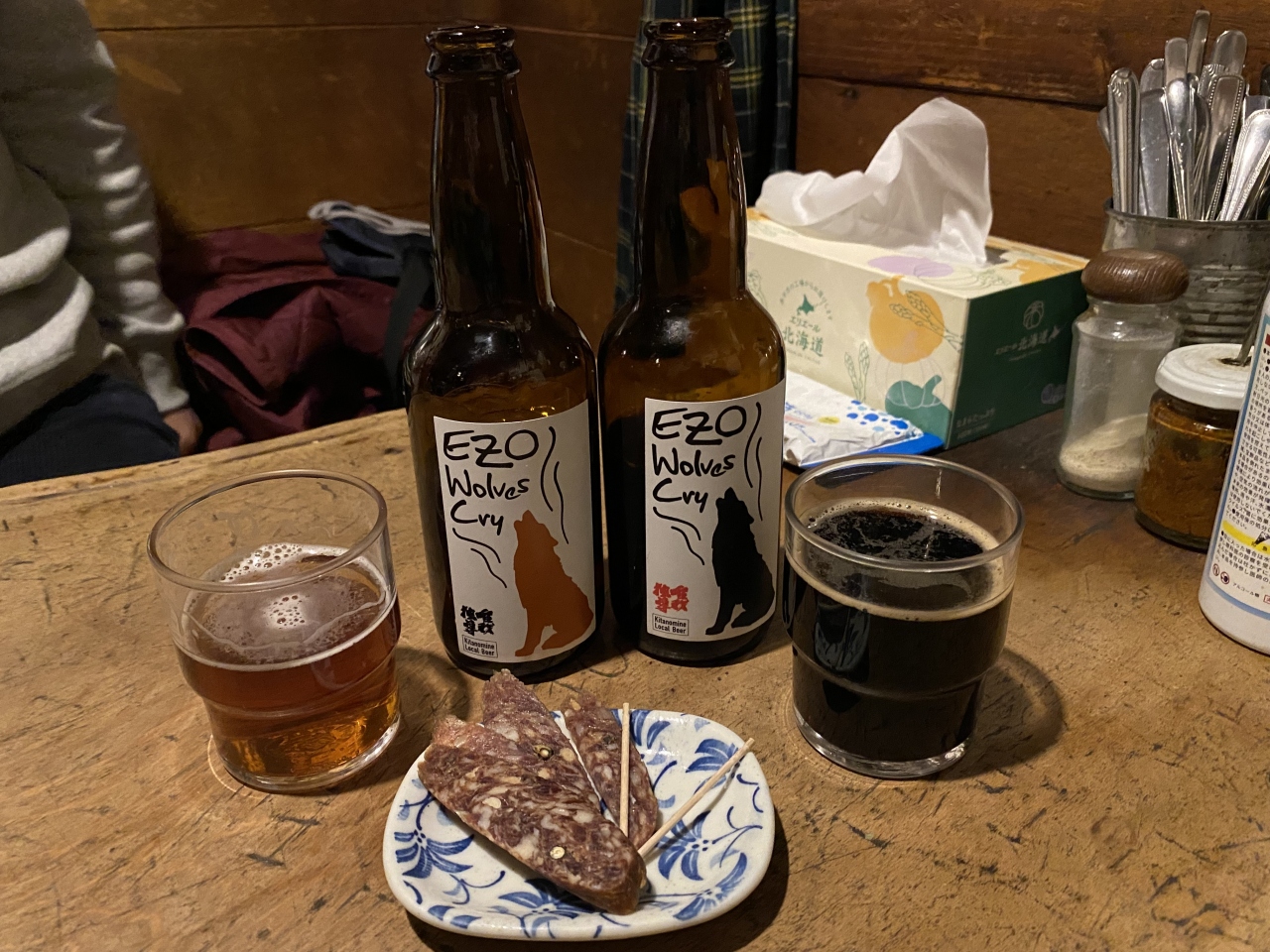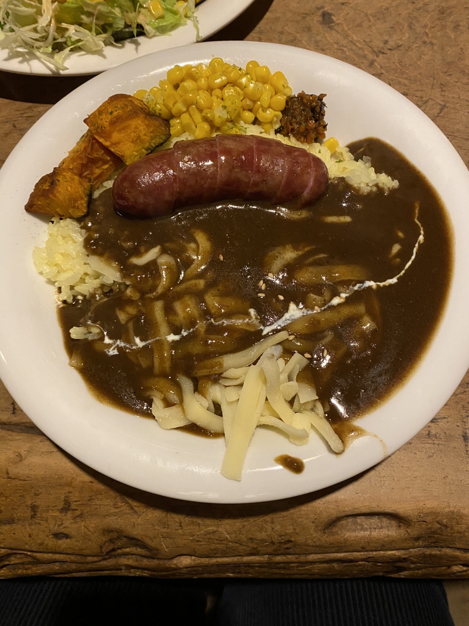 ビールと「オム+ソーセージカレー」と「自家製ソーセージ付きカレーのチーズトッピング」を注文。ビールはこの店オリジナルの地ビールでした。
