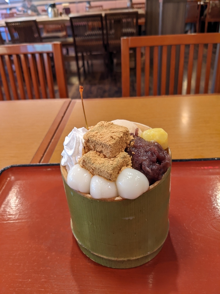 1階が店舗、2階がカフェになっています。飲食しながら嵐山の雰囲気を存分に楽しめるのではないでしょうか。竹筒に入ったわらび餅のパフェをいただきました。会計は現金のみ。カード類は一切使えません(2022年9月現在)。