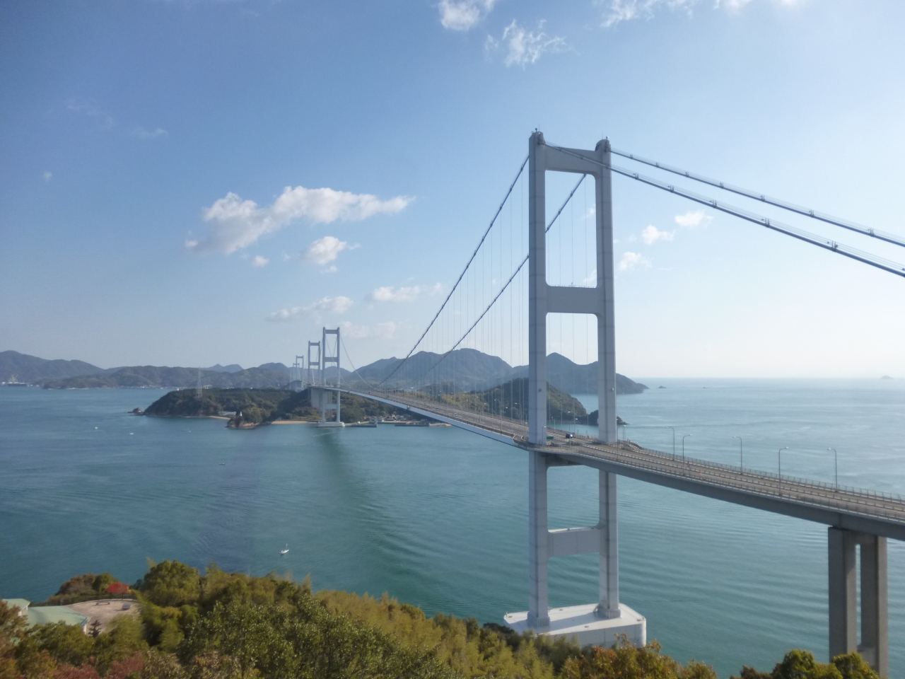 しまなみ海道今治北ICから車で5分ほどのところ、橋を渡る前に糸山展望台から来島海峡大橋を眺めました。青い海に点々と散らばる緑の島、そしてそこに架かる長い橋。とても美しい風景であり、自然の美しさと人間の力のすごさを感じました。3つの長大橋梁により構成された世界初の3連吊橋です。
