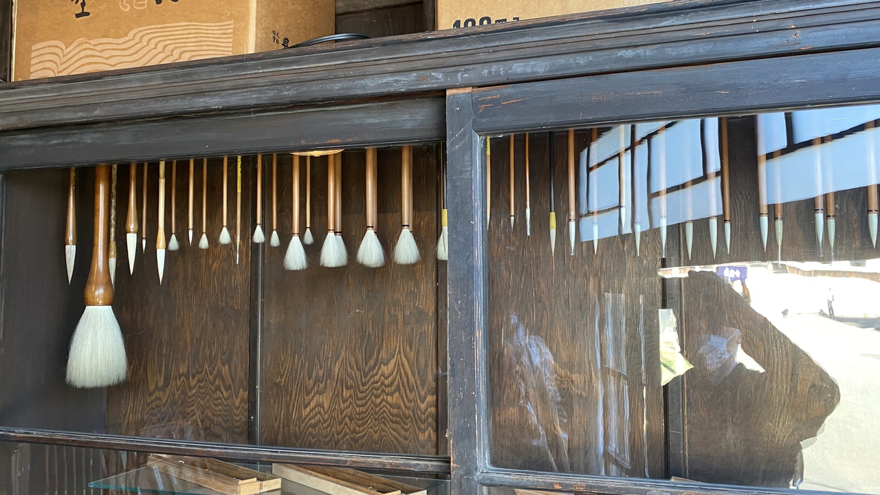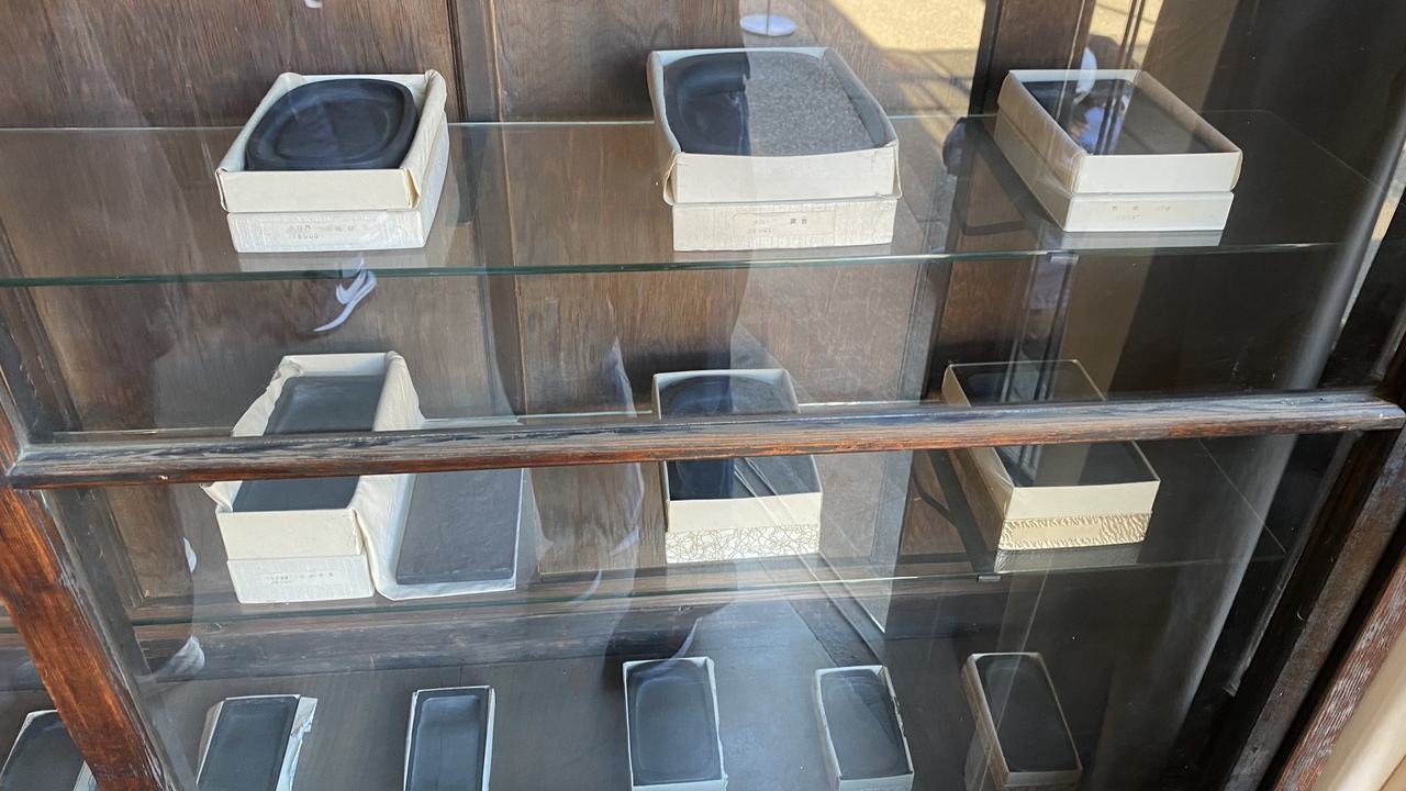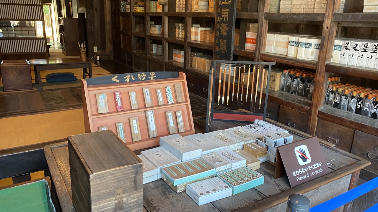 江戸東京たてもの園の東ゾーンにある建物です。隣の生花店は整備中で左隣は食堂件休憩所になってます。この時代の昔の文具といえば筆と墨なんですね。たくさんの墨汁や硯箱や筆のディスプレイが所狭しと並んでます。