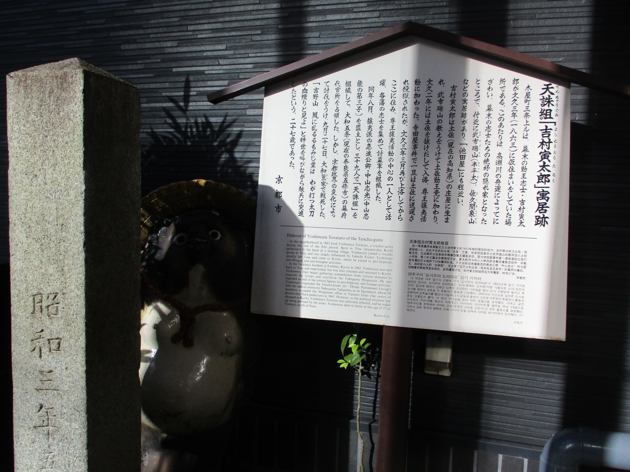 木屋町通り沿い、三条通の北を歩いていた時に碑を見かけました。ビルの横にあります。読みやすい説明板があります。あと、なぜか信楽焼の狸の置物もあります。狸がなかったらちょっと見つけにくいかも?と思いました。吉村寅太郎は土佐出身の尊王攘夷派の志士です。天誅組を結成した人です。すぐ近くに師と仰いだ武市瑞山の寓居跡碑もあります。