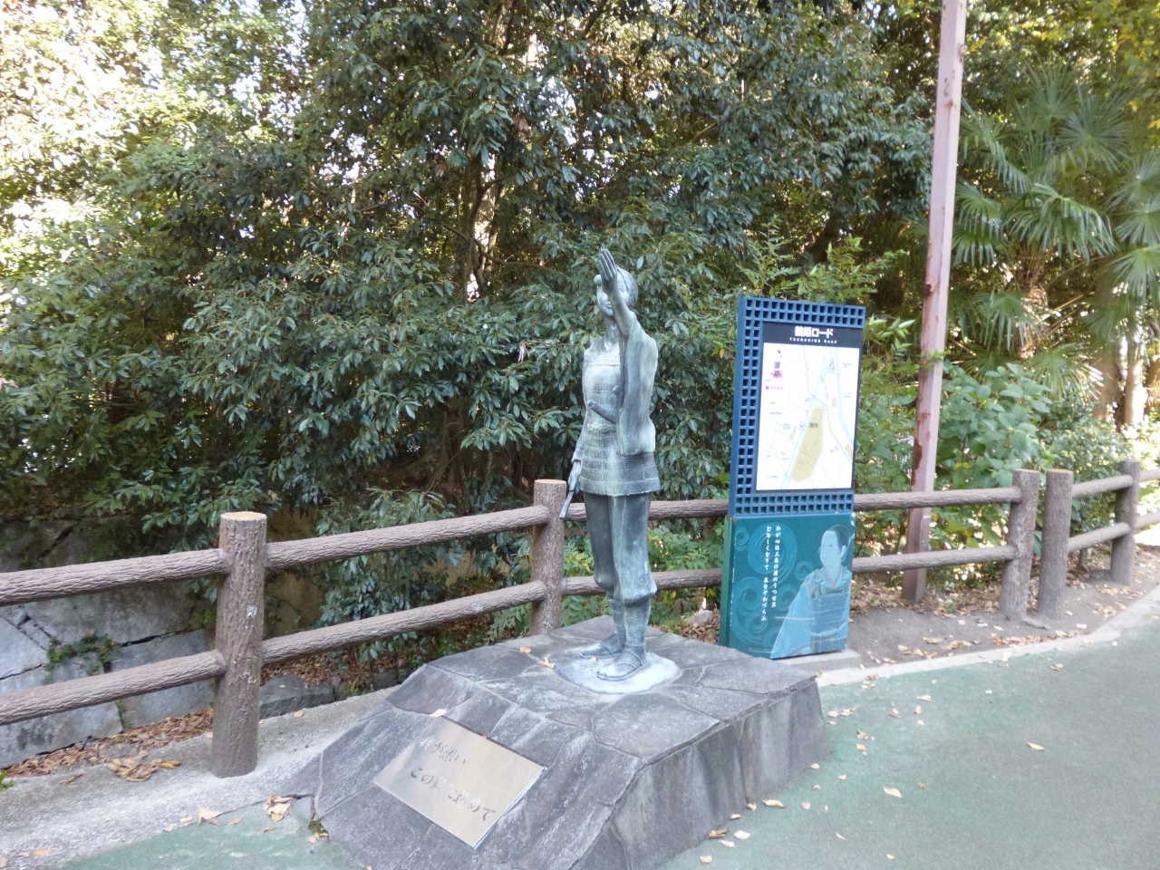 しまなみ海道、愛媛の北端の島、大三島にある大山祇神社の宝物館の脇の通りから北西へ向かって歩いていくと、鶴姫の像があり、鶴姫公園までの間、鶴姫公園への案内になっています。鶴姫は大宮司・大祝安用の娘で戦国時代に武将として活躍をしたそうです。しかし18歳の時、戦いの中、恋人が戦死。自身も、夜小船でこぎ出し、母の形見の鈴を胸に抱き恋人の後を慕って海に消えたという悲しいお話です。
