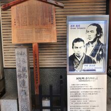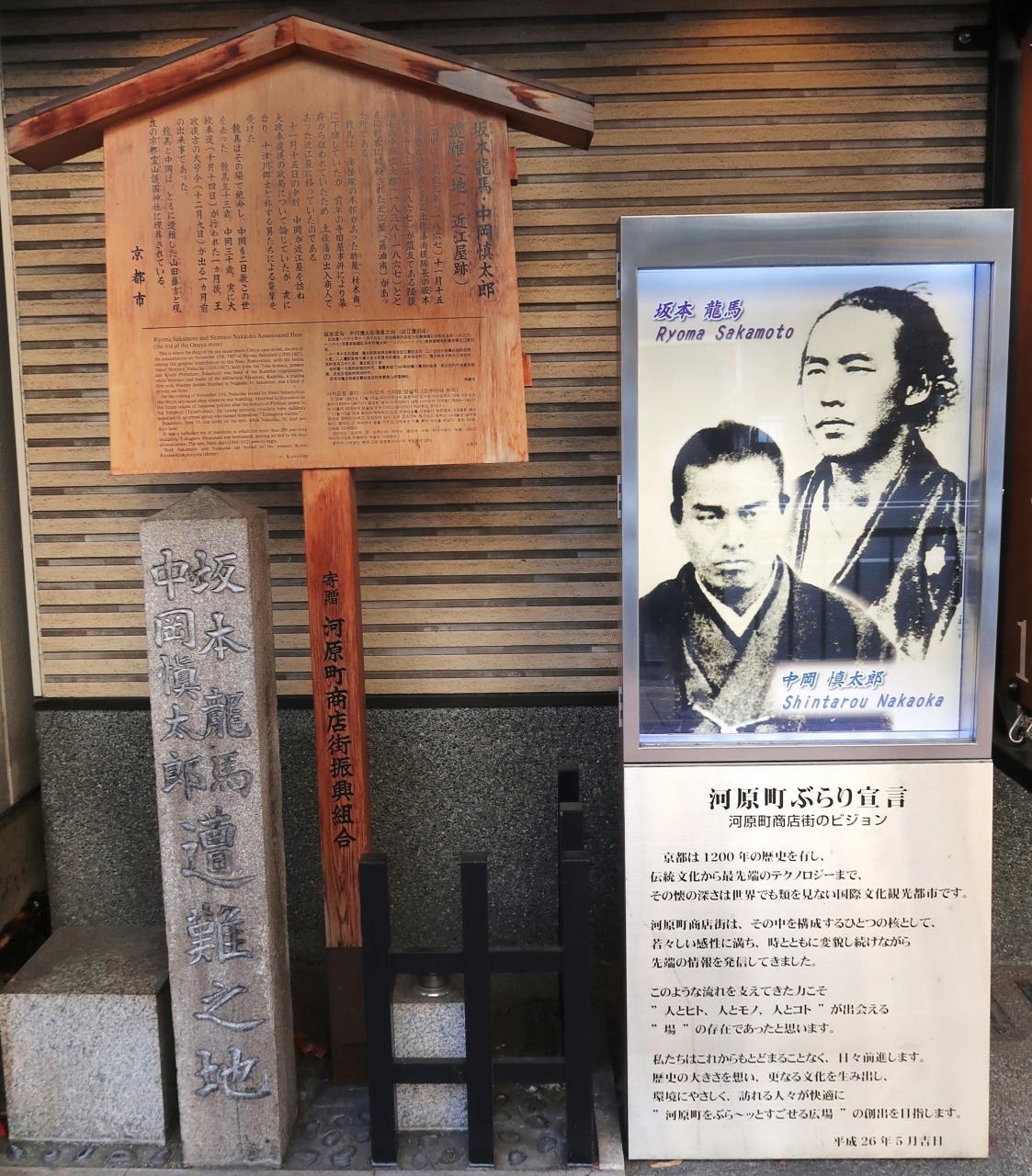 河原町通りを歩いていると回転ずしがあり、その隣に石碑と説明板がありました。1867年11月15日、坂本龍馬と中岡慎太郎が暗殺された近江屋があった場所でした。明治維新のドラマでは必ず目にするシーンですが、十津川郷士を名乗った犯人が誰だったのかは不明なままだそうです。二人は龍馬坂を上がった先、現在の京都霊山護国神社に埋葬されています。