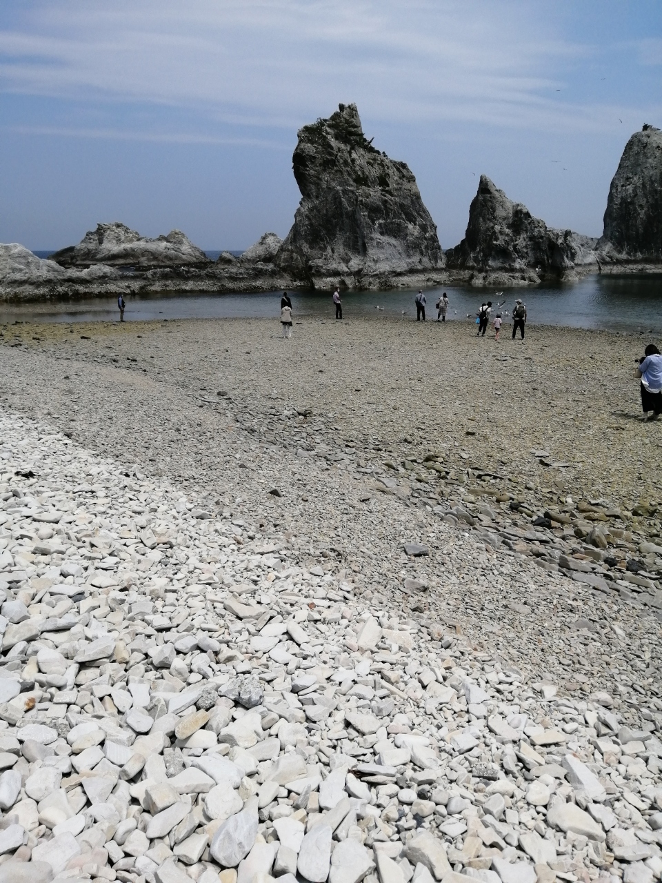 白い石と青い海の海岸からは大きな岩が見えて、とてもきれいでした。