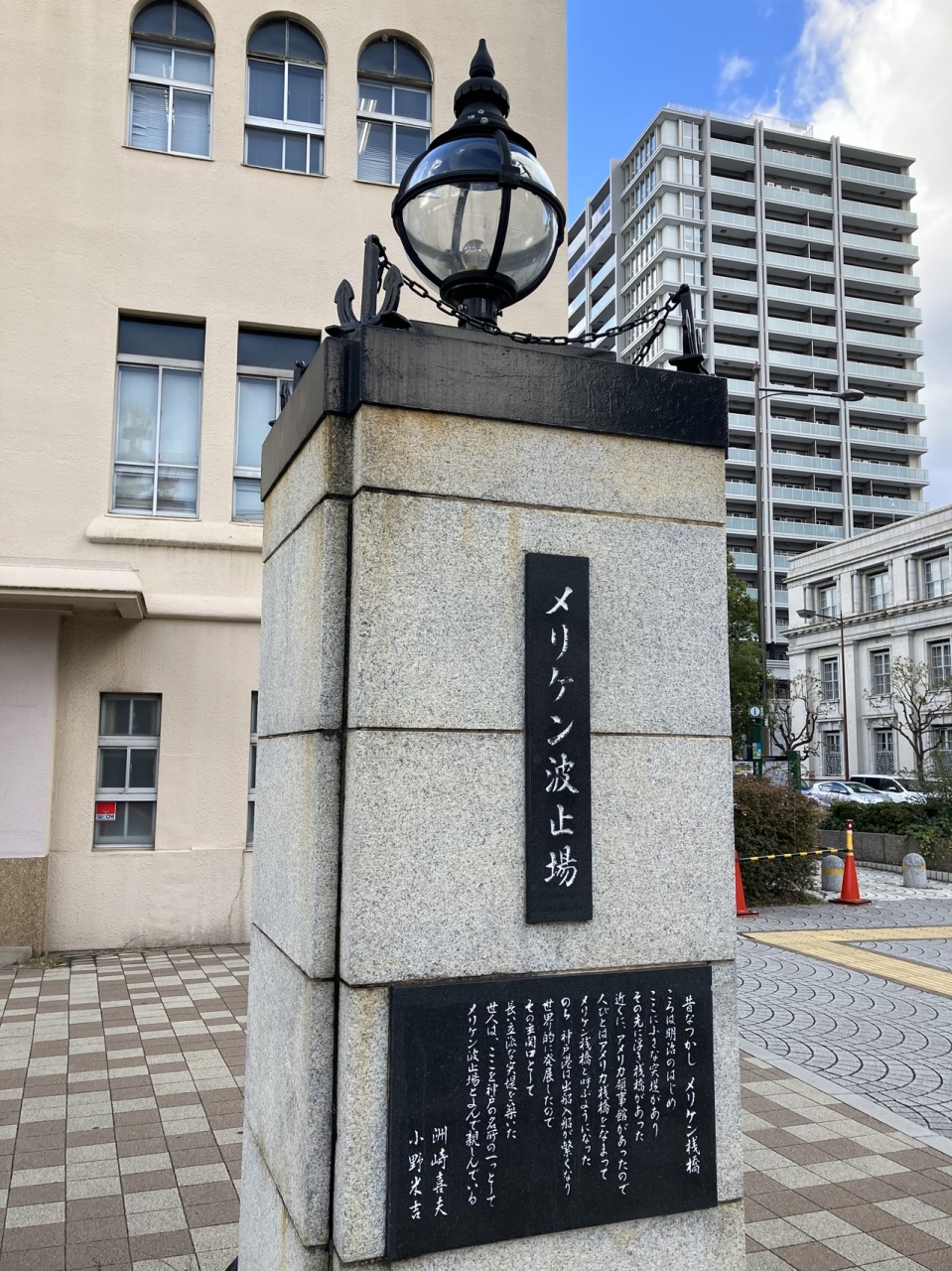 神戸旅行でベイエリアにあるメリケンパークに立ち寄った際に、入口に設置されたメリケン波止場の碑を見つけました。石碑には、「神戸税関 萬国波止場」と書かれたプレートや「昔なつかし メリケン桟橋」という説明のプレートが埋め込まれていました。