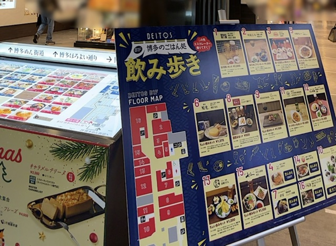 福岡土産の店が数多く並ぶほか、ラーメン屋や居酒屋なども飲食店もあり、昼から福岡の味と酒が楽しめます。