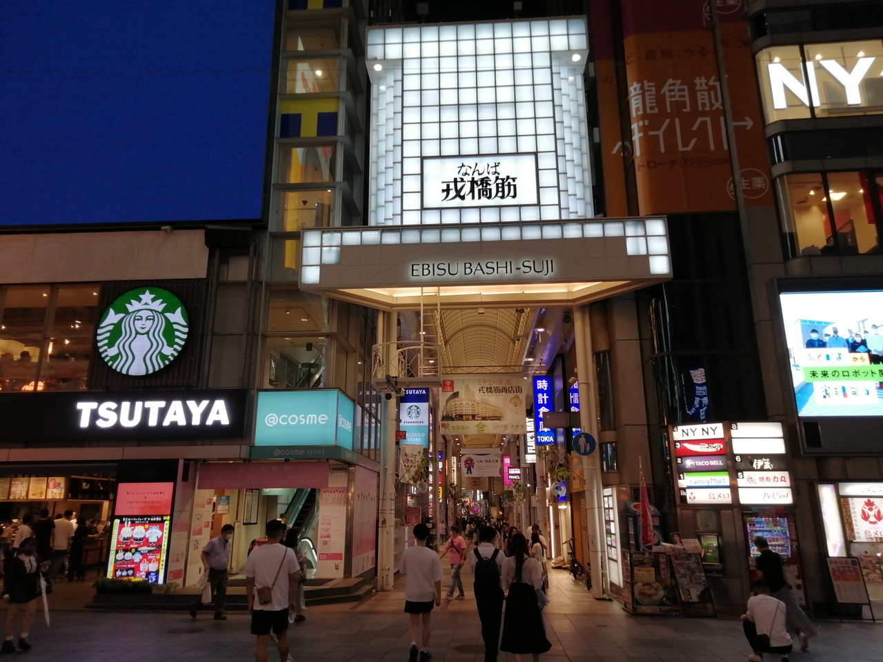 北は戎橋、南は大阪高島屋までを結ぶ400mほどの大阪ミナミの中心的なアーケード商店街です。もちろんとても賑やかな通りなのですが道幅はそれほど広くないので自分のペースでは歩けない。結構なストレスです。