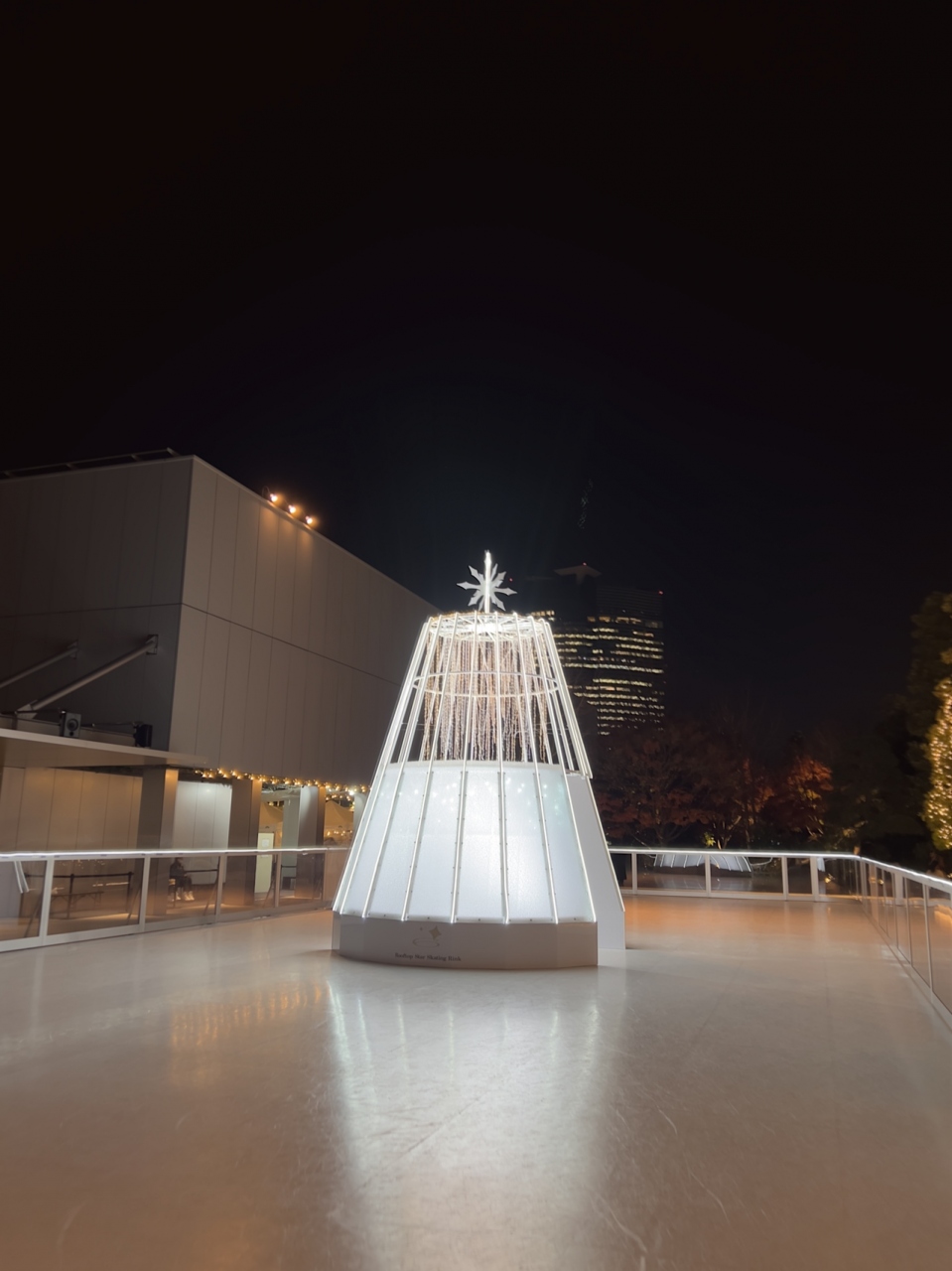 屋上にはスケートリンクができていました。そのリンクの中央には真っ白なツリー、リンクの隣にはドームテント、木々はシャンパンゴールドにライトアップされていました。