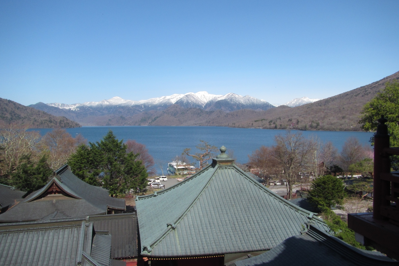 中善寺から眺めると遠くの山に雪も残っており男体山が大きく後ろに見えて山に囲まれた湖という印象です